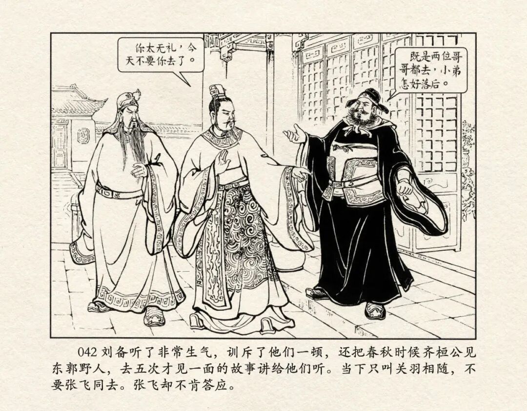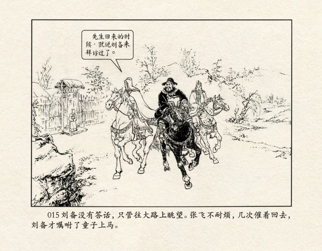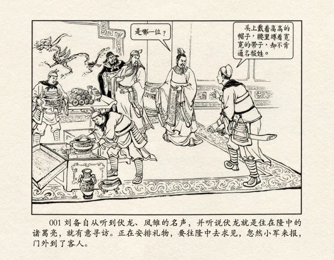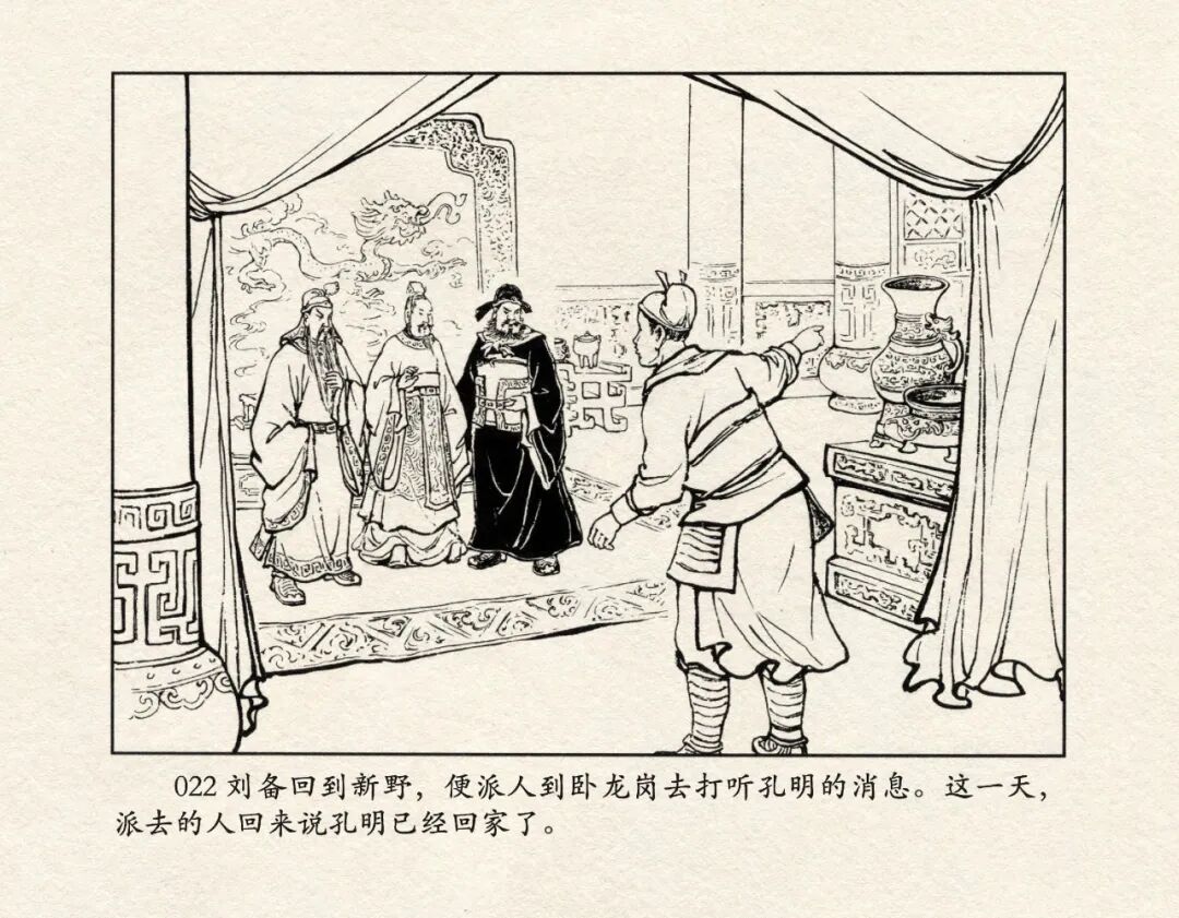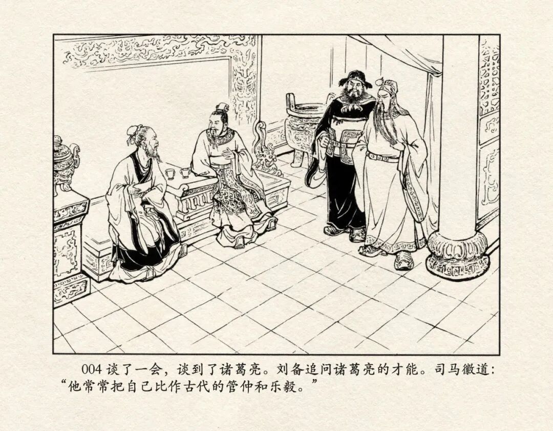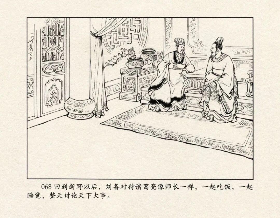 《三国演义》中诸多重头戏都和“三”有关系,比如“桃园三结义”、“三让徐州”、“三气周瑜”等,而最著名最有画面感的一场戏当然要数“三顾茅庐”。三顾之礼是极为隆重的礼节,通常在天子迎接德望极高的大儒才使用。对一个无官无职且年轻的人行此大礼,实在是极为反常。刘备这么做,除了表明对诸葛亮的重视,无疑是在向还处于观望态度的士人,表明自己对人才的渴望。也许刘备心中也是愿意做足了这个排场,等着好戏开场的。2、马中赤兔、人中吕布初登场。陈光镒连环画作品《董卓进京》