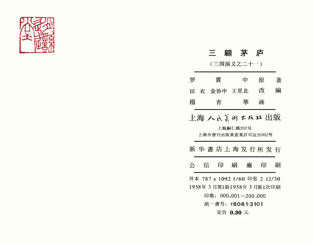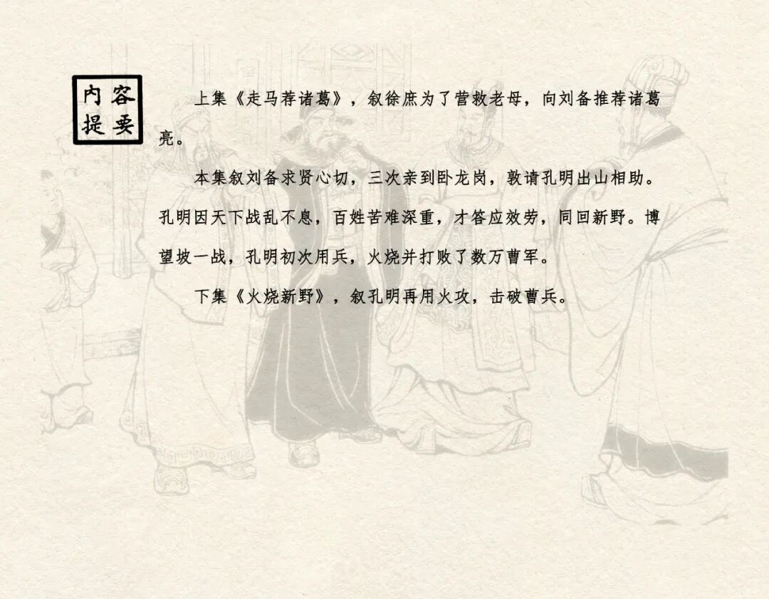 《三顾茅庐》是上海人民美术出版社《三国演义》系列连环画套书的第二十一册,由杨青华绘画,封面绘画刘旦宅。初版于1958年3月,印量20万册,计142图。内容简介