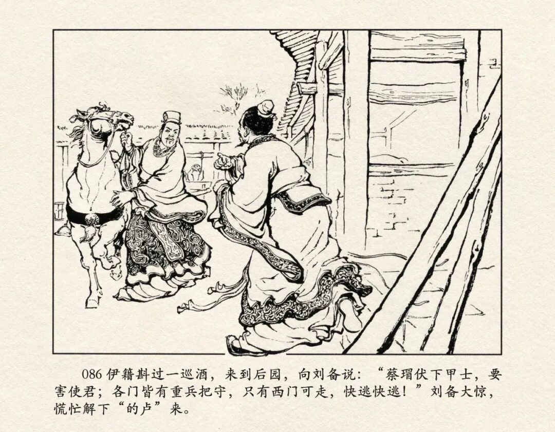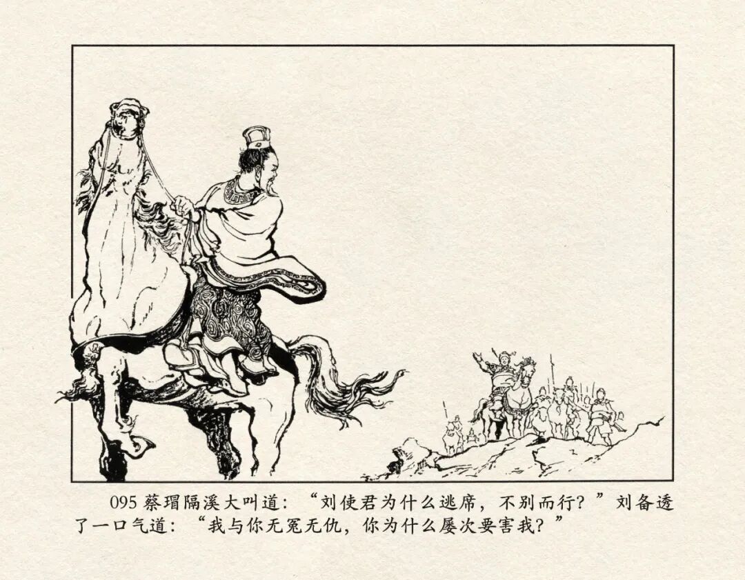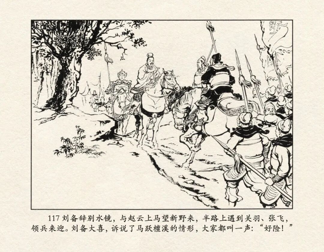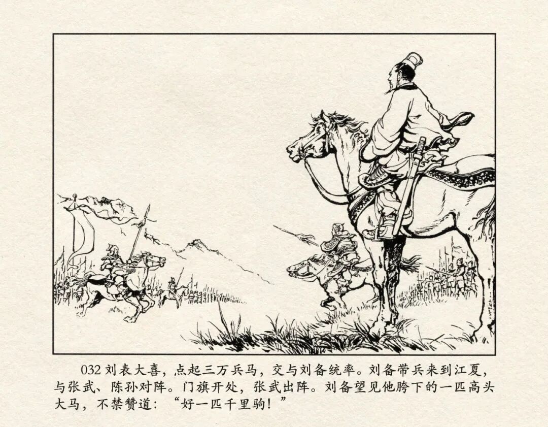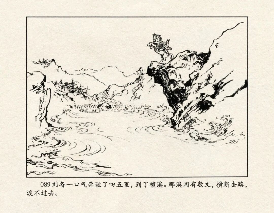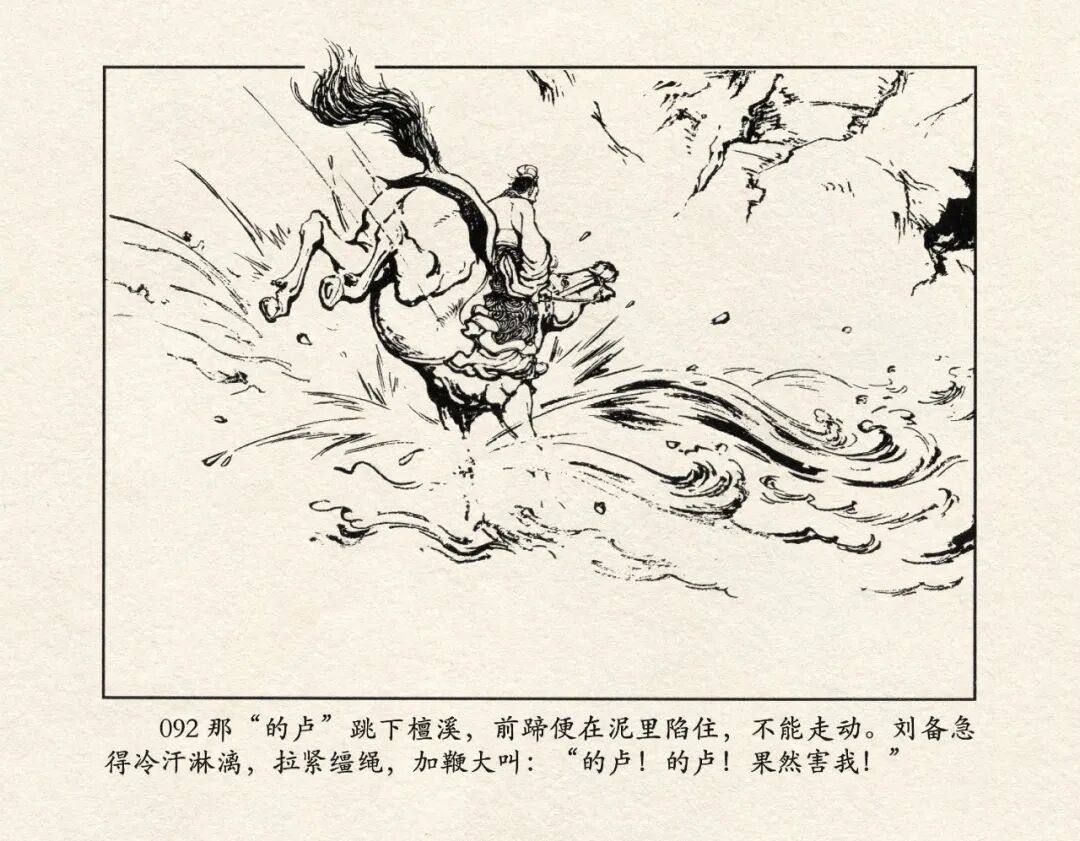 刘备跃马飞上西岸,策马扬鞭往西南而去了。蔡瑁引军追至檀溪边,见刘备已远去,不禁叹道:刘备真有神助,命不皆死!2、马中赤兔、人中吕布初登场。陈光镒连环画作品《董卓进京》