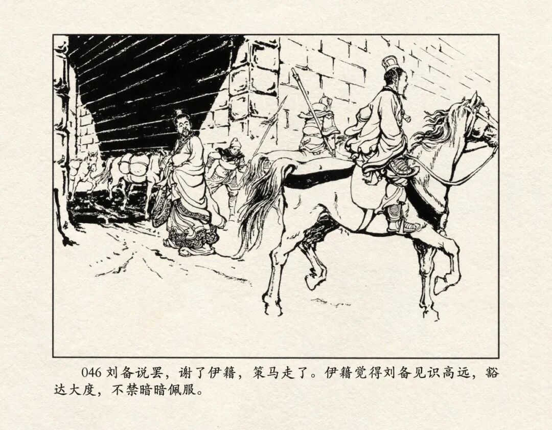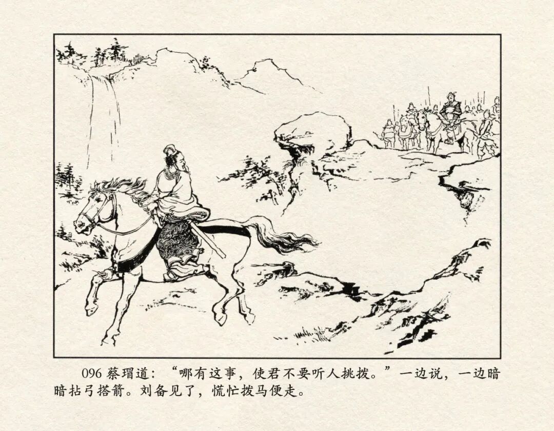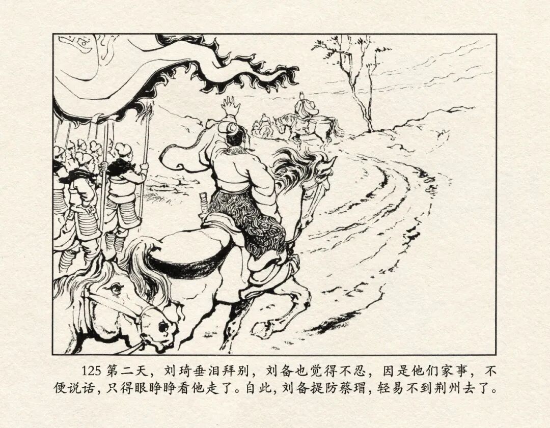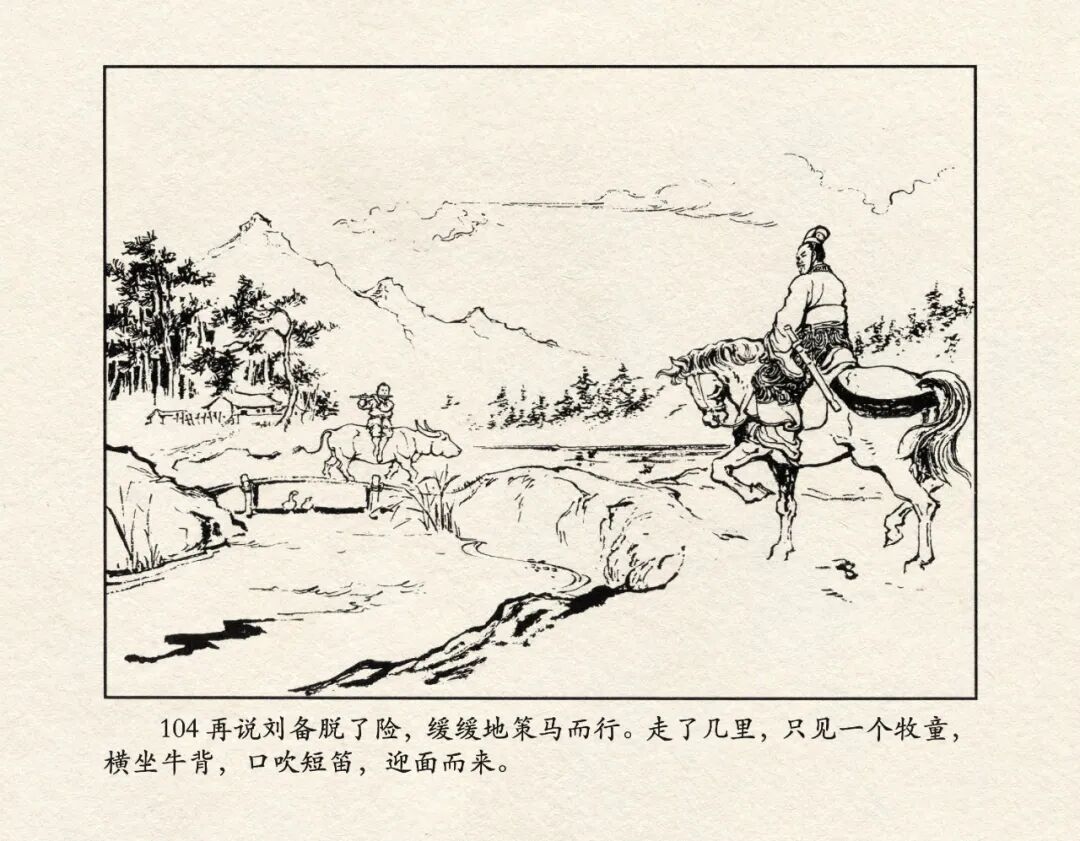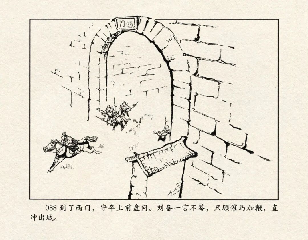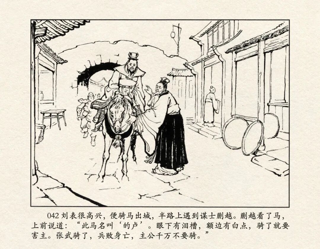 刘备跃马飞上西岸,策马扬鞭往西南而去了。蔡瑁引军追至檀溪边,见刘备已远去,不禁叹道:刘备真有神助,命不皆死!2、马中赤兔、人中吕布初登场。陈光镒连环画作品《董卓进京》