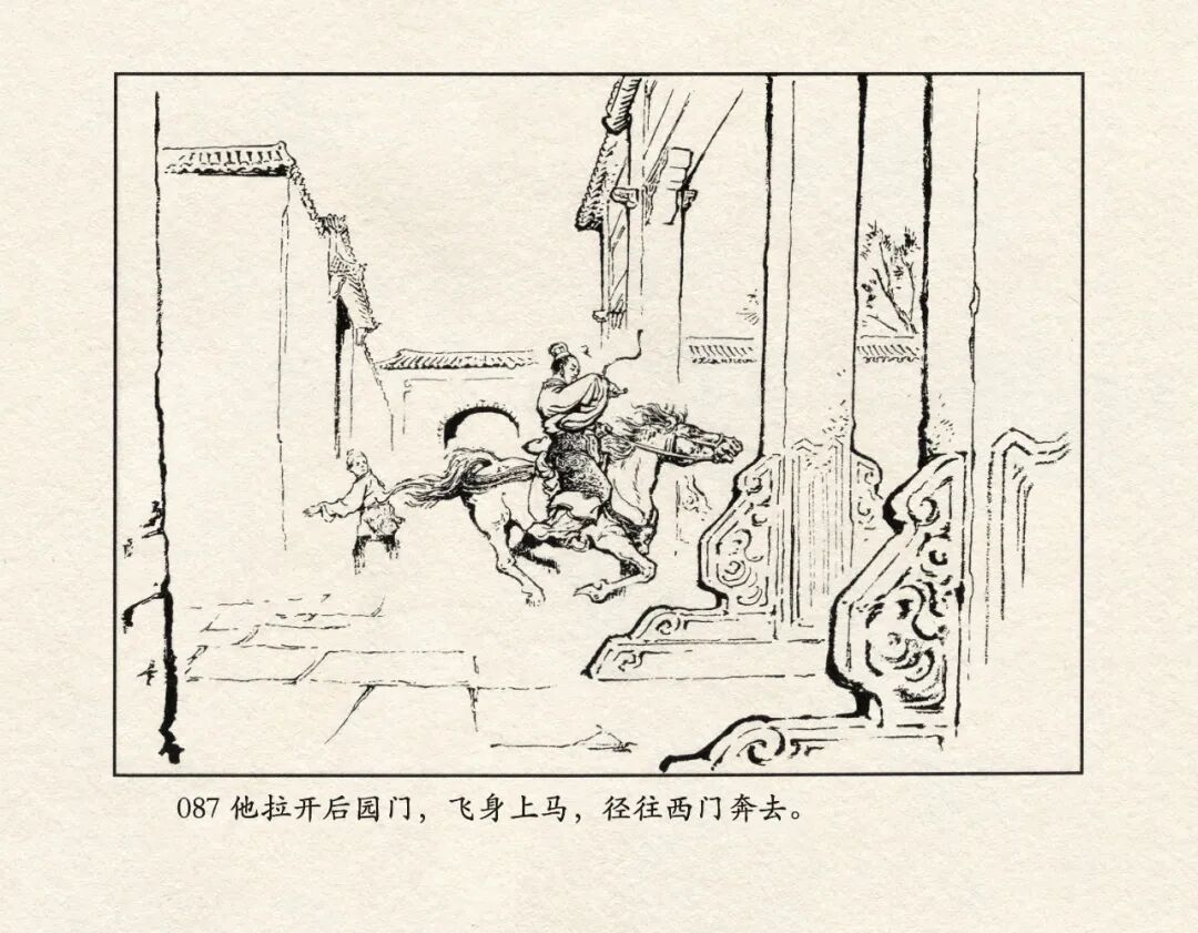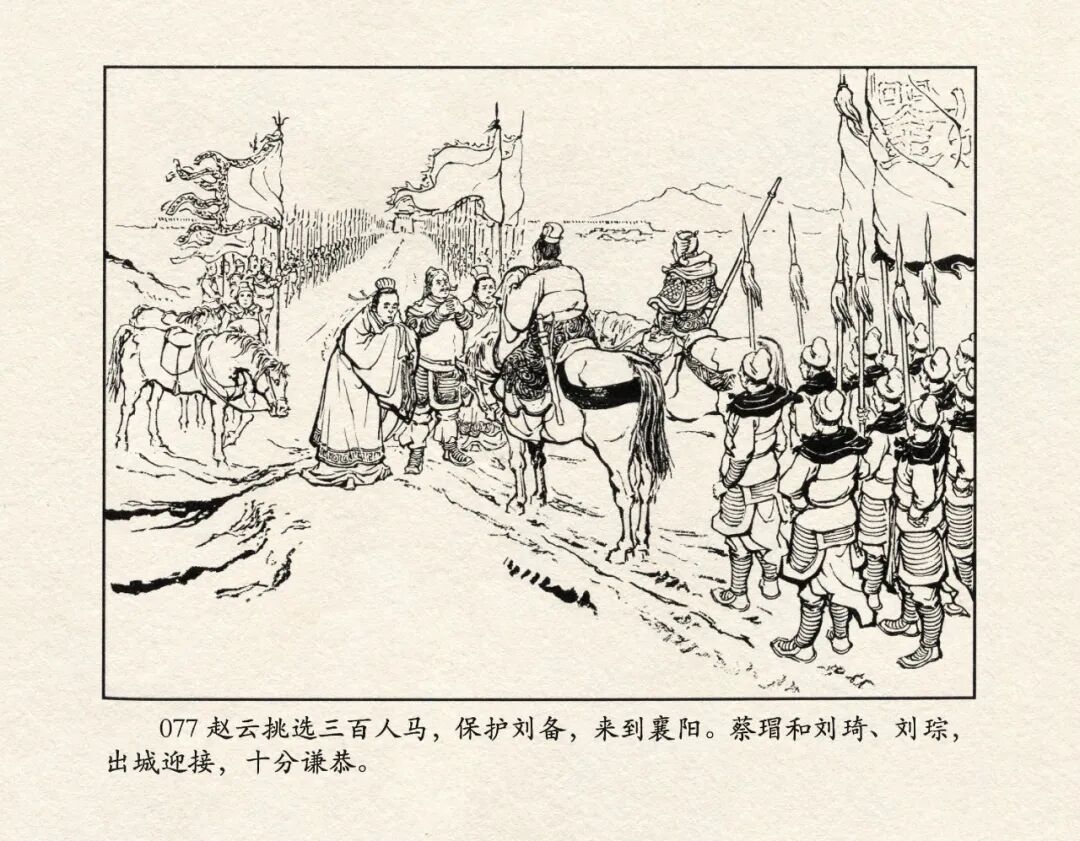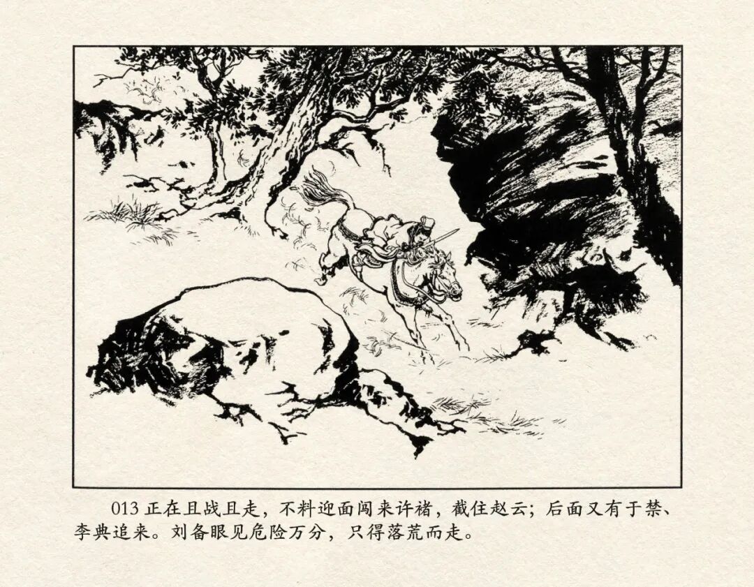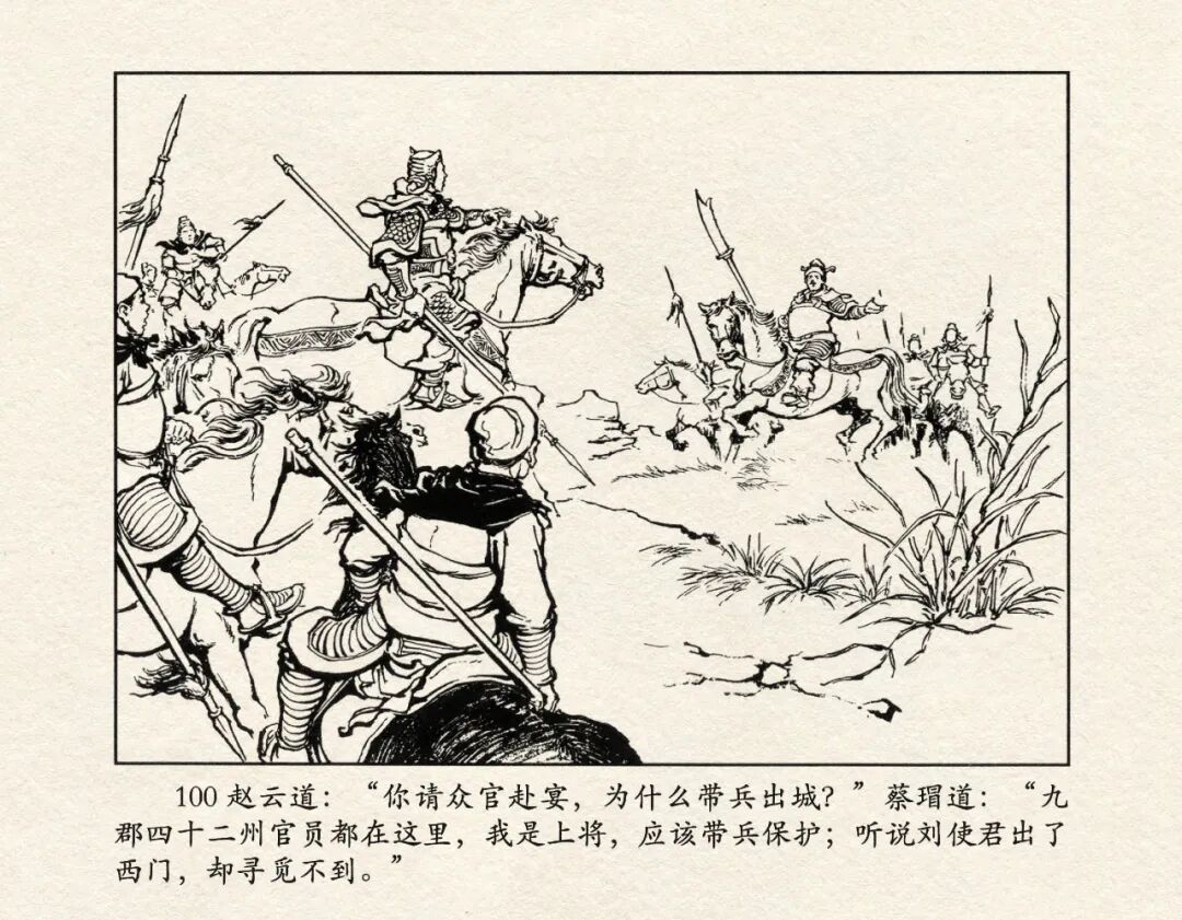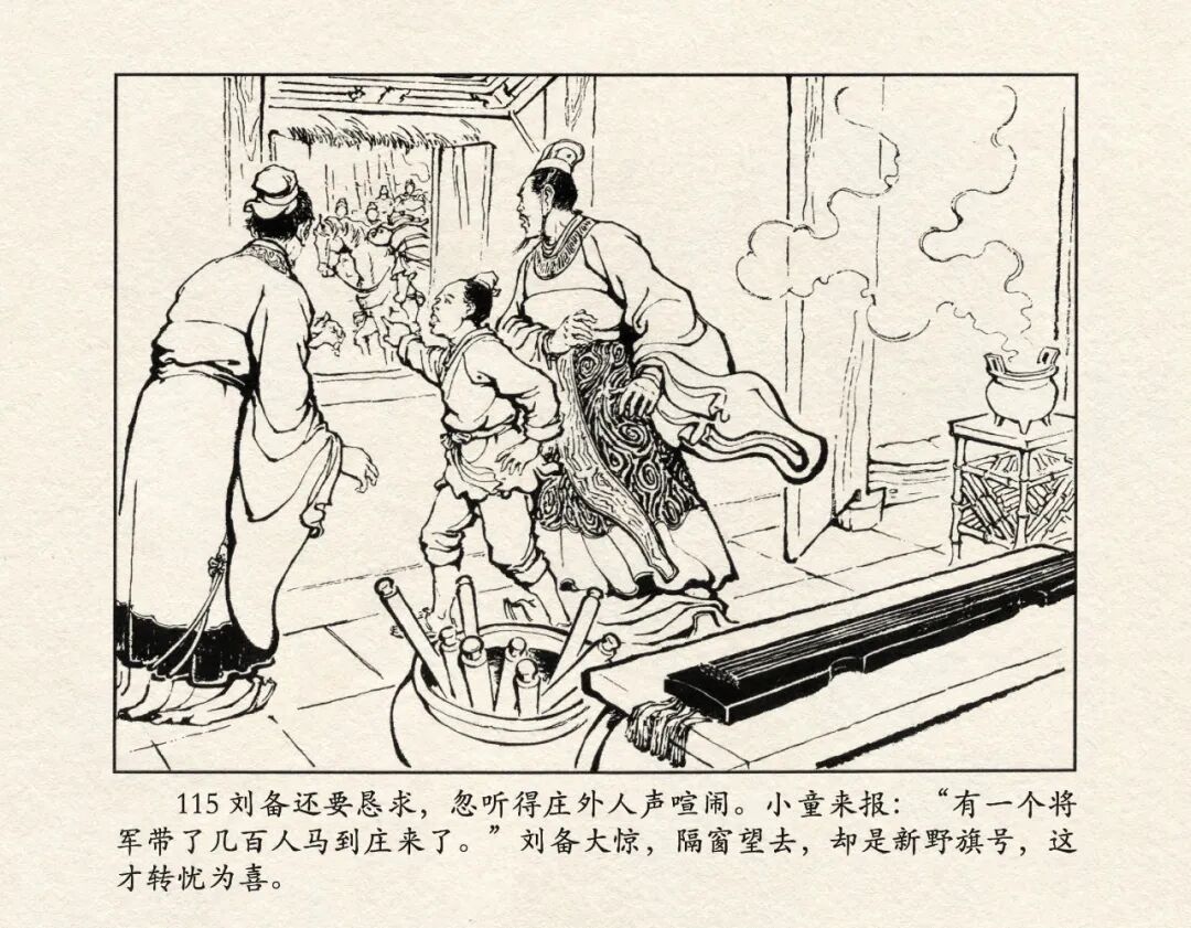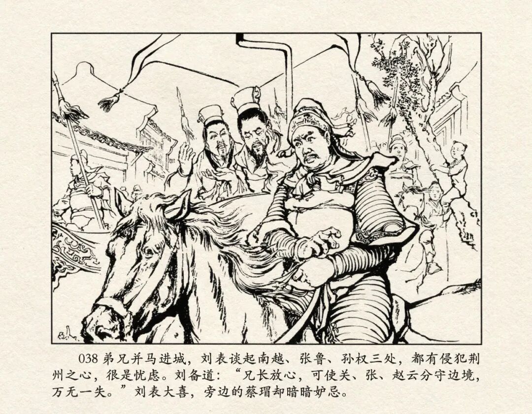 刘备跃马飞上西岸,策马扬鞭往西南而去了。蔡瑁引军追至檀溪边,见刘备已远去,不禁叹道:刘备真有神助,命不皆死!2、马中赤兔、人中吕布初登场。陈光镒连环画作品《董卓进京》