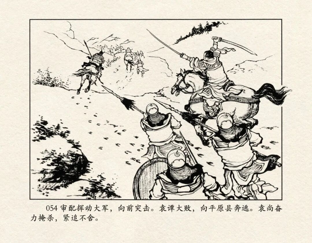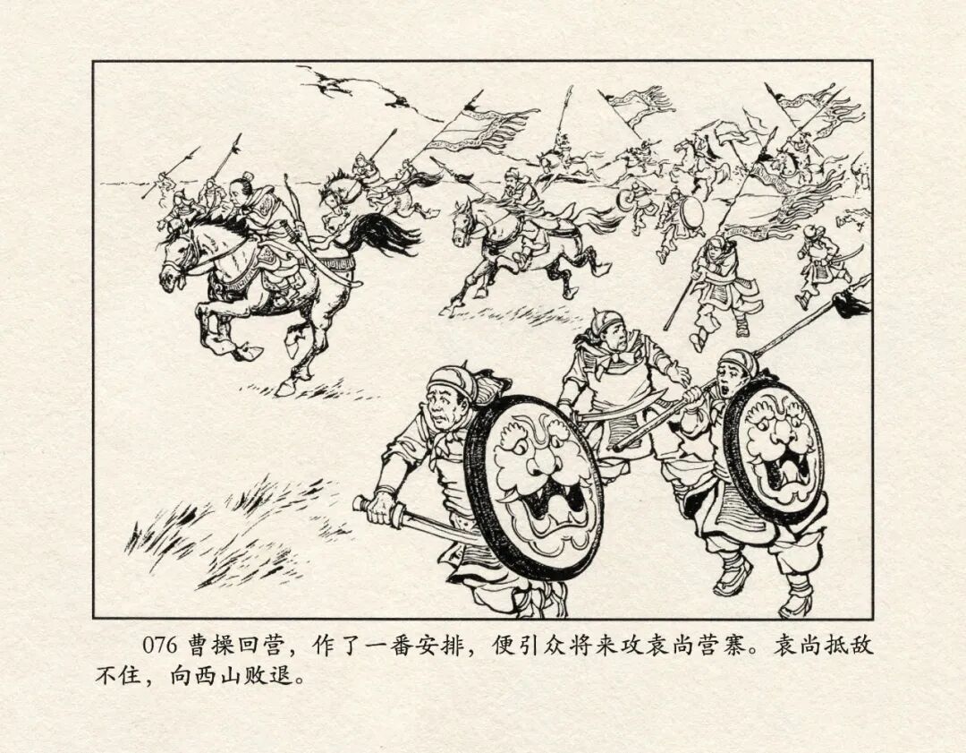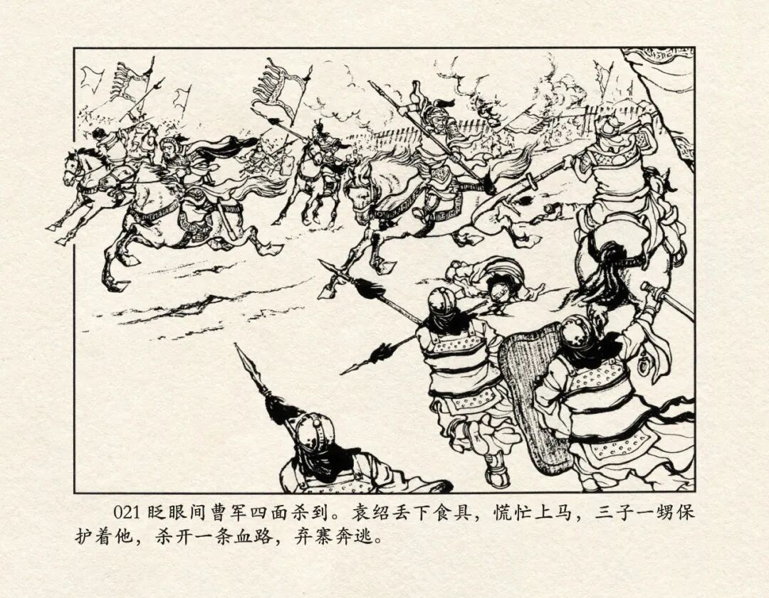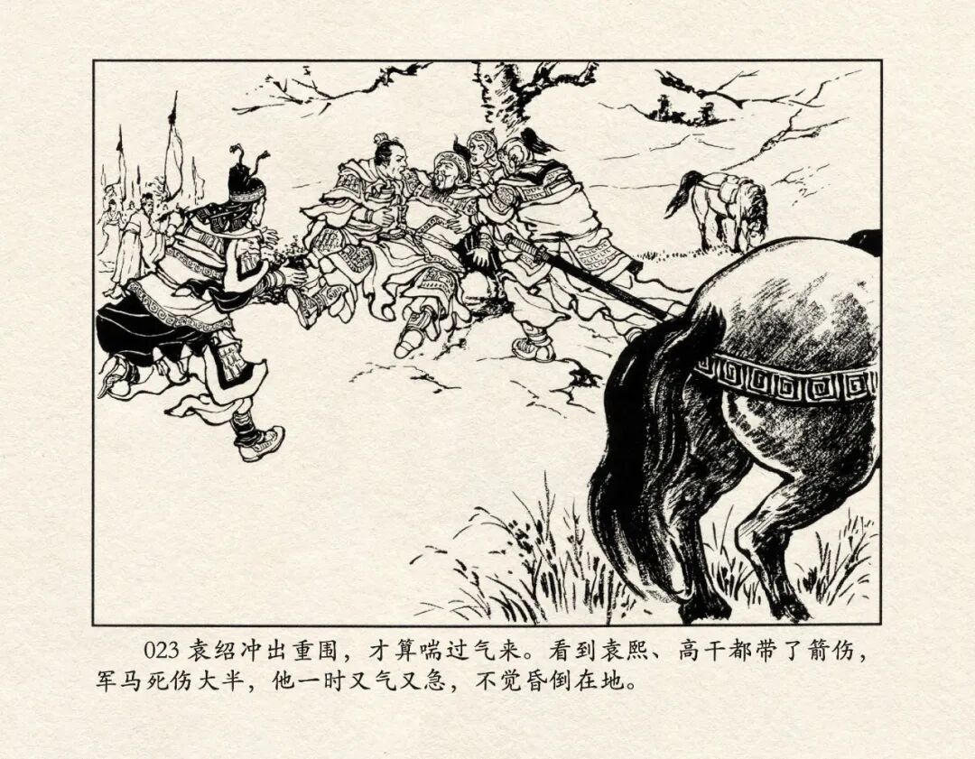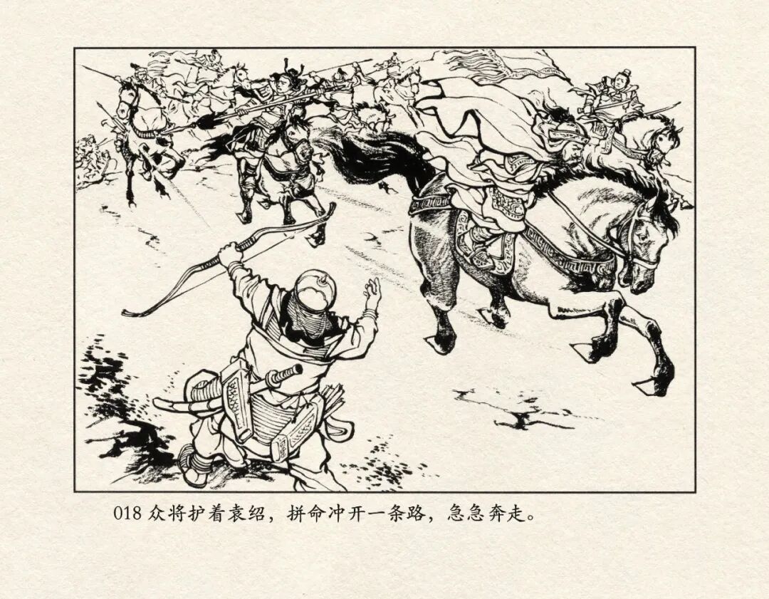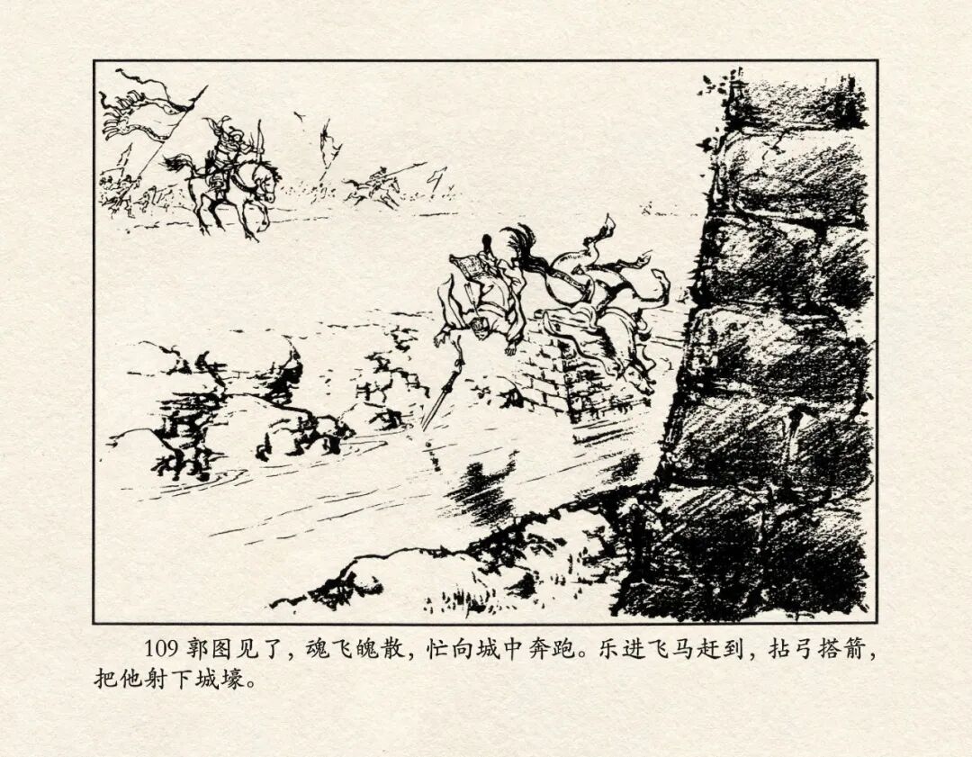 败退了,逃命啊!不是应该所有的人一律都拼命逃跑嘛!可左下角的小兵却偏偏回头拉弓放箭,阻击追赶的敌人,看来也不是所有的人都胆小,只会一味拼命溃逃,勇敢的人也是有的。在其他画册中真的极少看到这样别致的构图。
