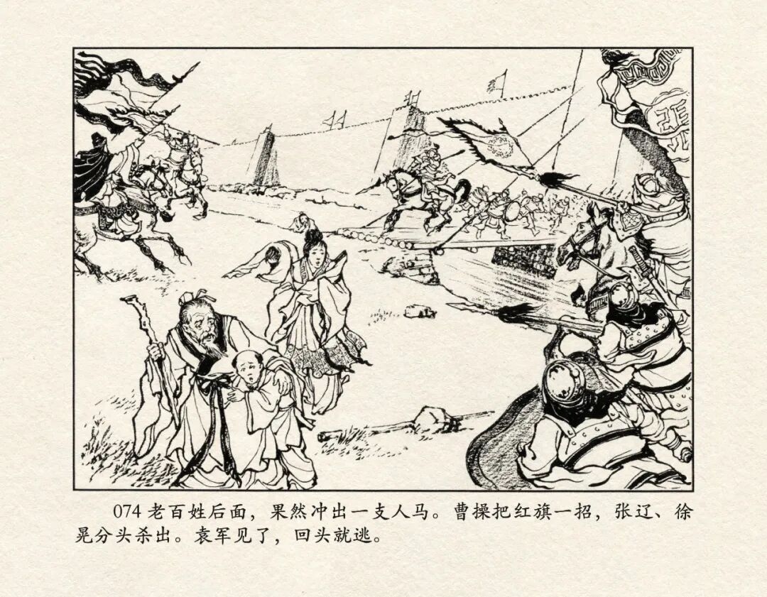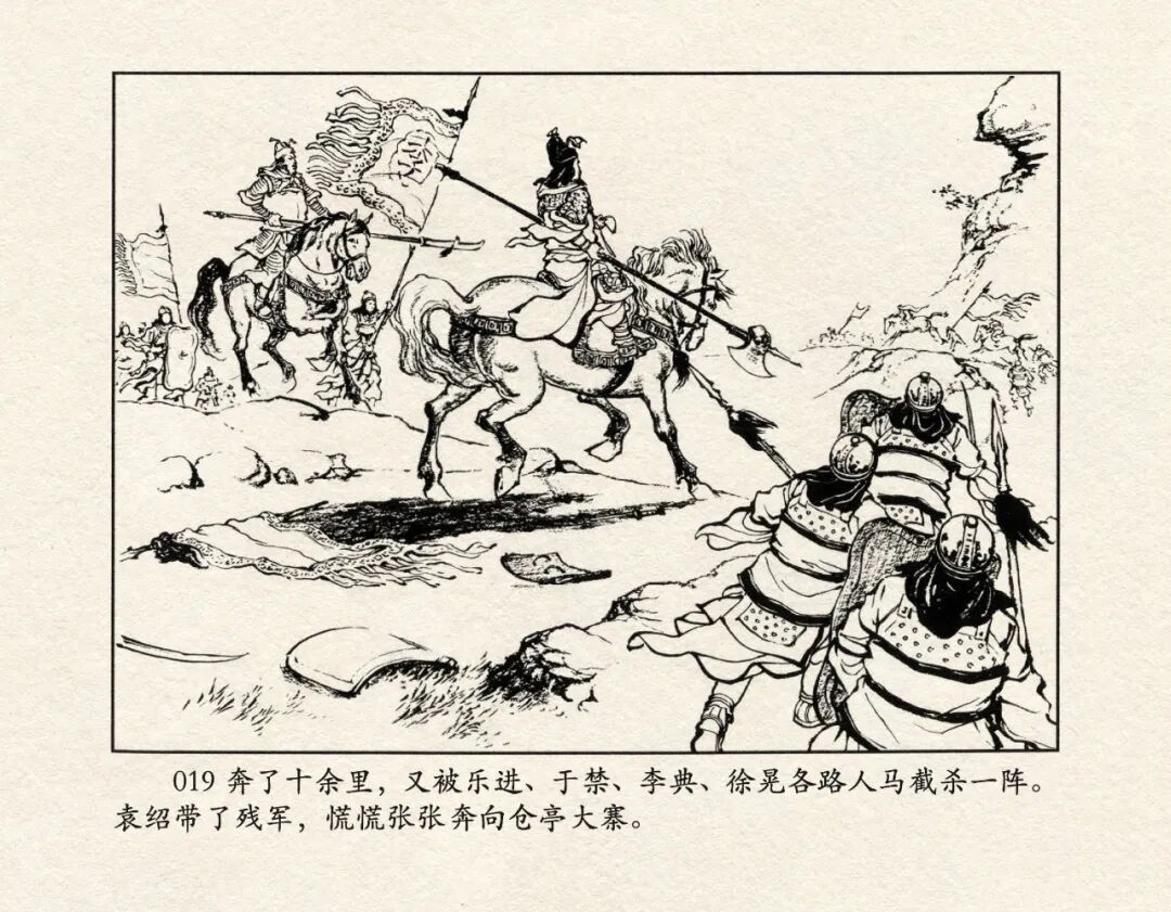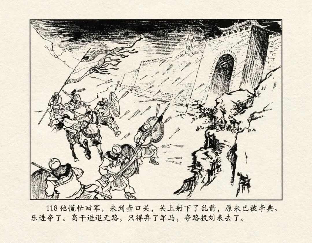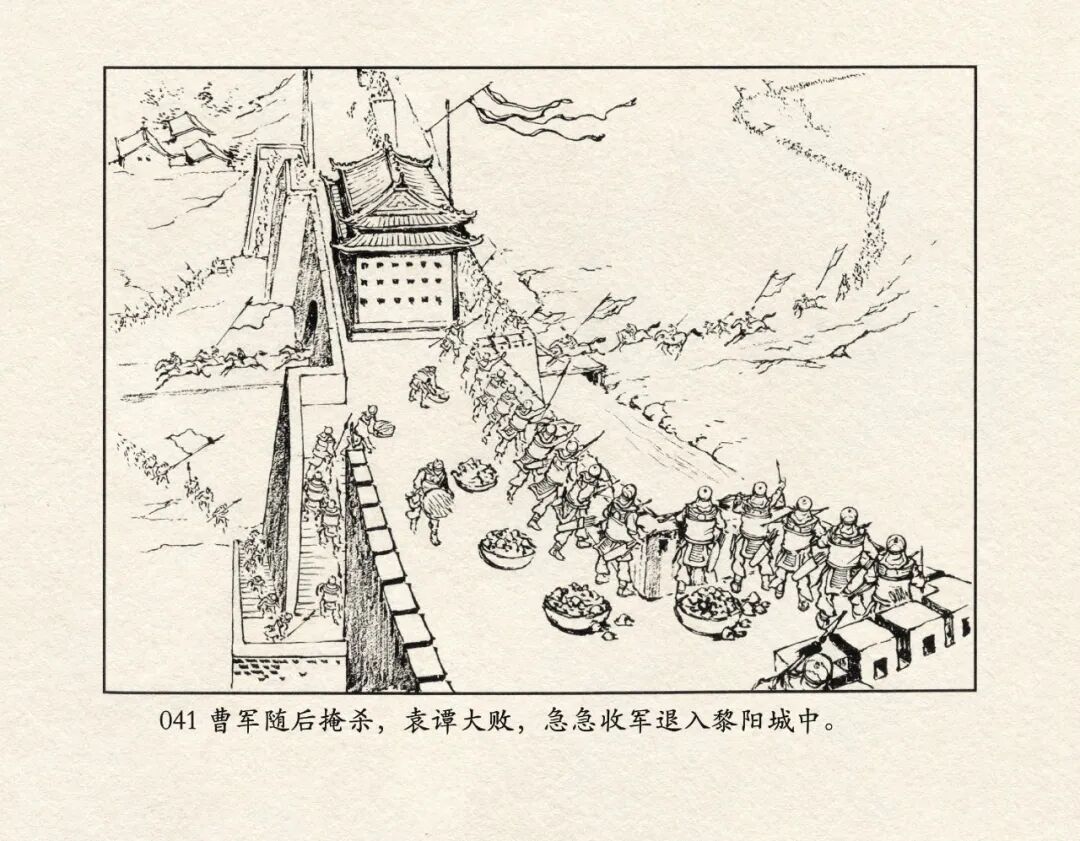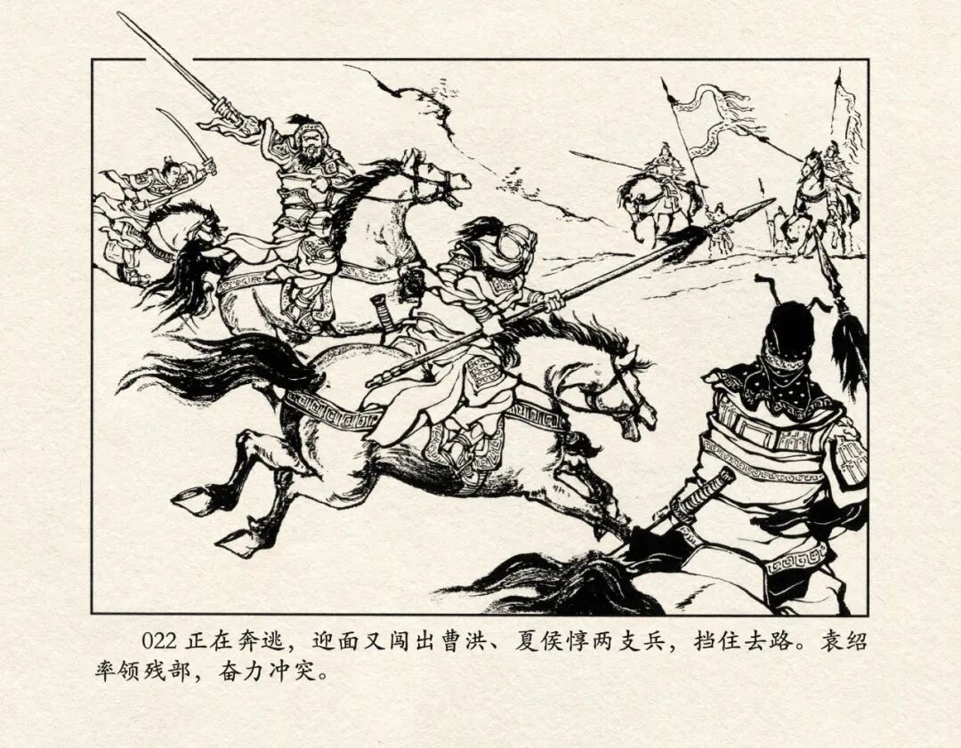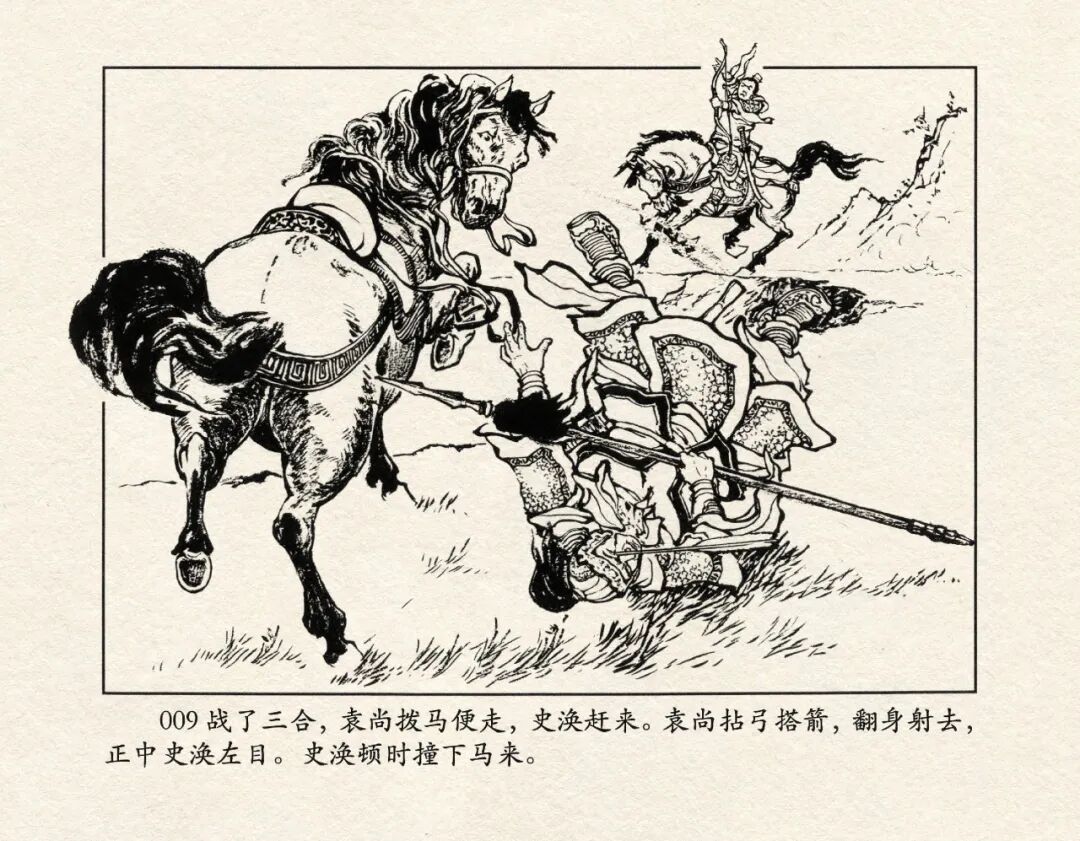 败退了,逃命啊!不是应该所有的人一律都拼命逃跑嘛!可左下角的小兵却偏偏回头拉弓放箭,阻击追赶的敌人,看来也不是所有的人都胆小,只会一味拼命溃逃,勇敢的人也是有的。在其他画册中真的极少看到这样别致的构图。