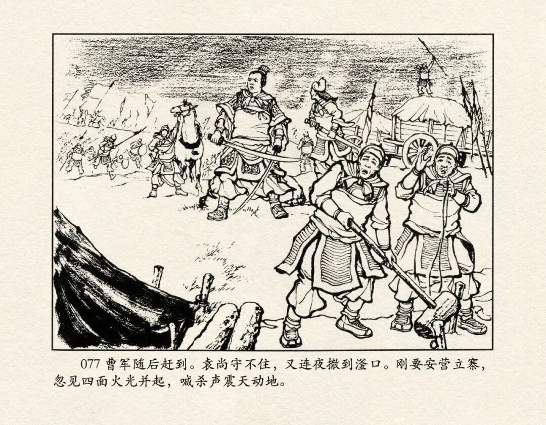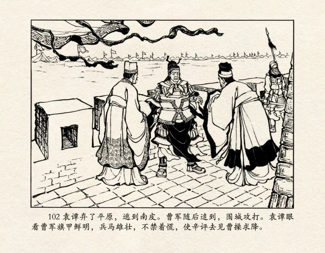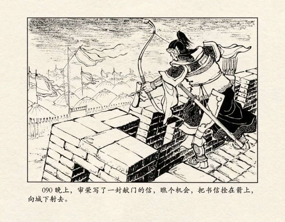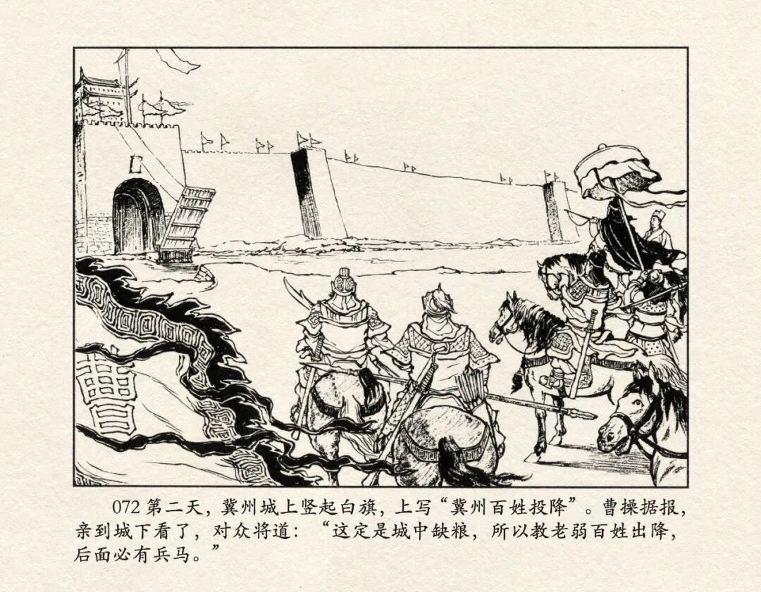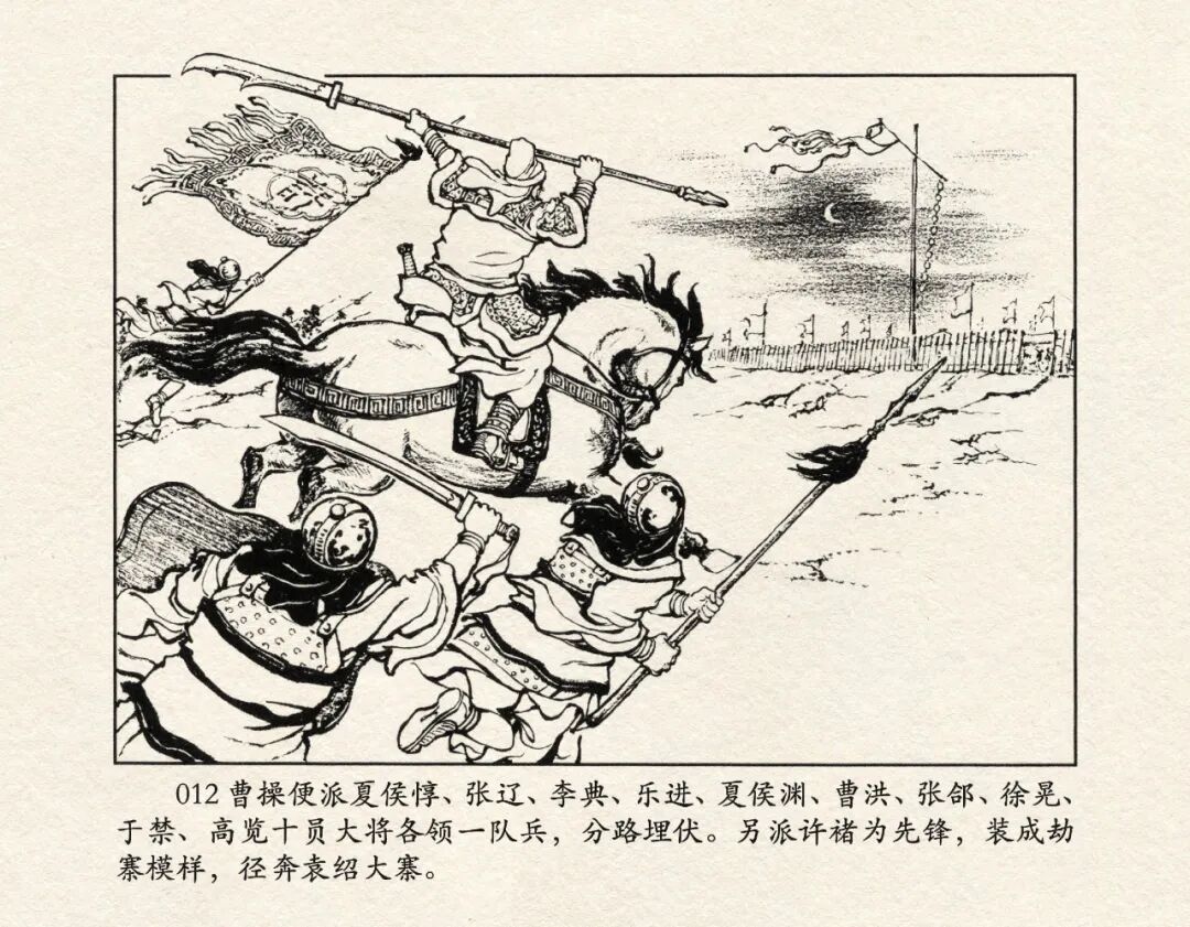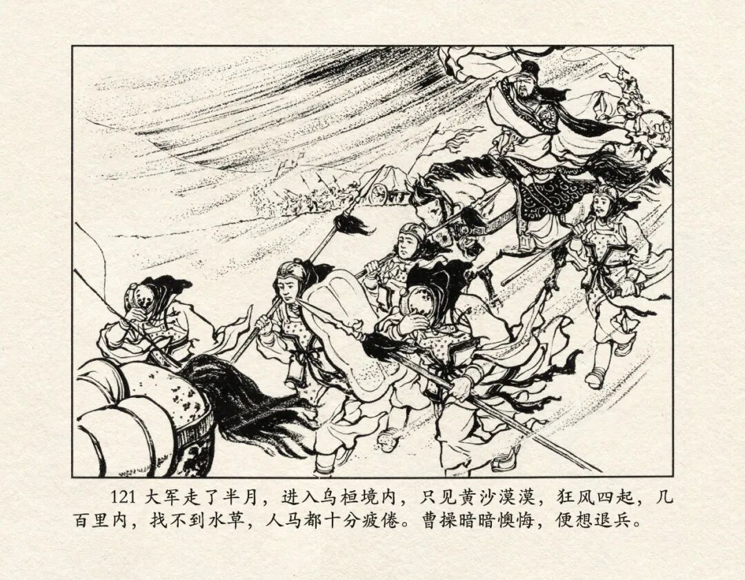 败退了,逃命啊!不是应该所有的人一律都拼命逃跑嘛!可左下角的小兵却偏偏回头拉弓放箭,阻击追赶的敌人,看来也不是所有的人都胆小,只会一味拼命溃逃,勇敢的人也是有的。在其他画册中真的极少看到这样别致的构图。