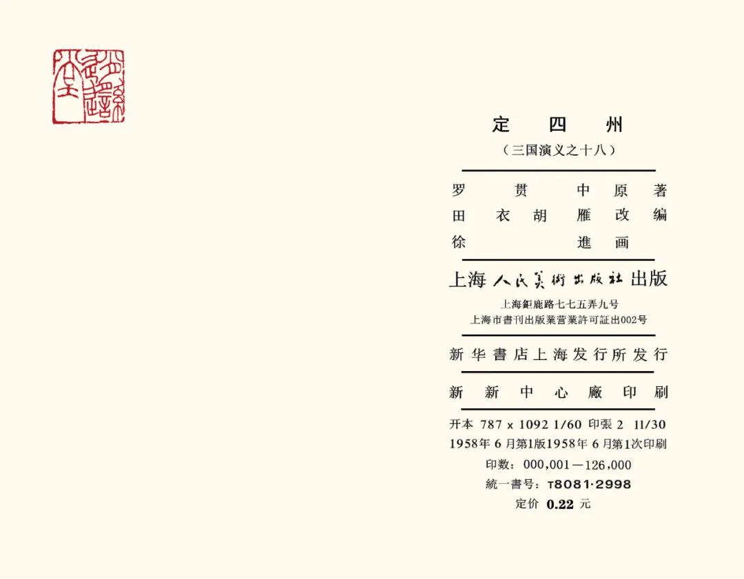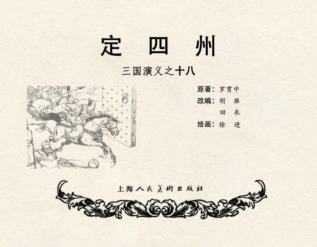 《定四州》是上海人民美术出版社《三国演义》系列连环画套书的第十八册,由徐进绘画,封面绘画金雪尘。初版于1958年6月,印量12.6万册,计140图。内容简介