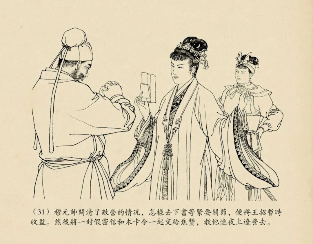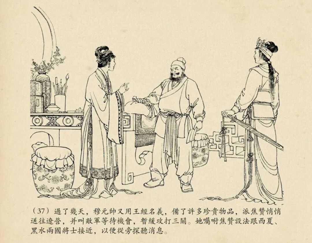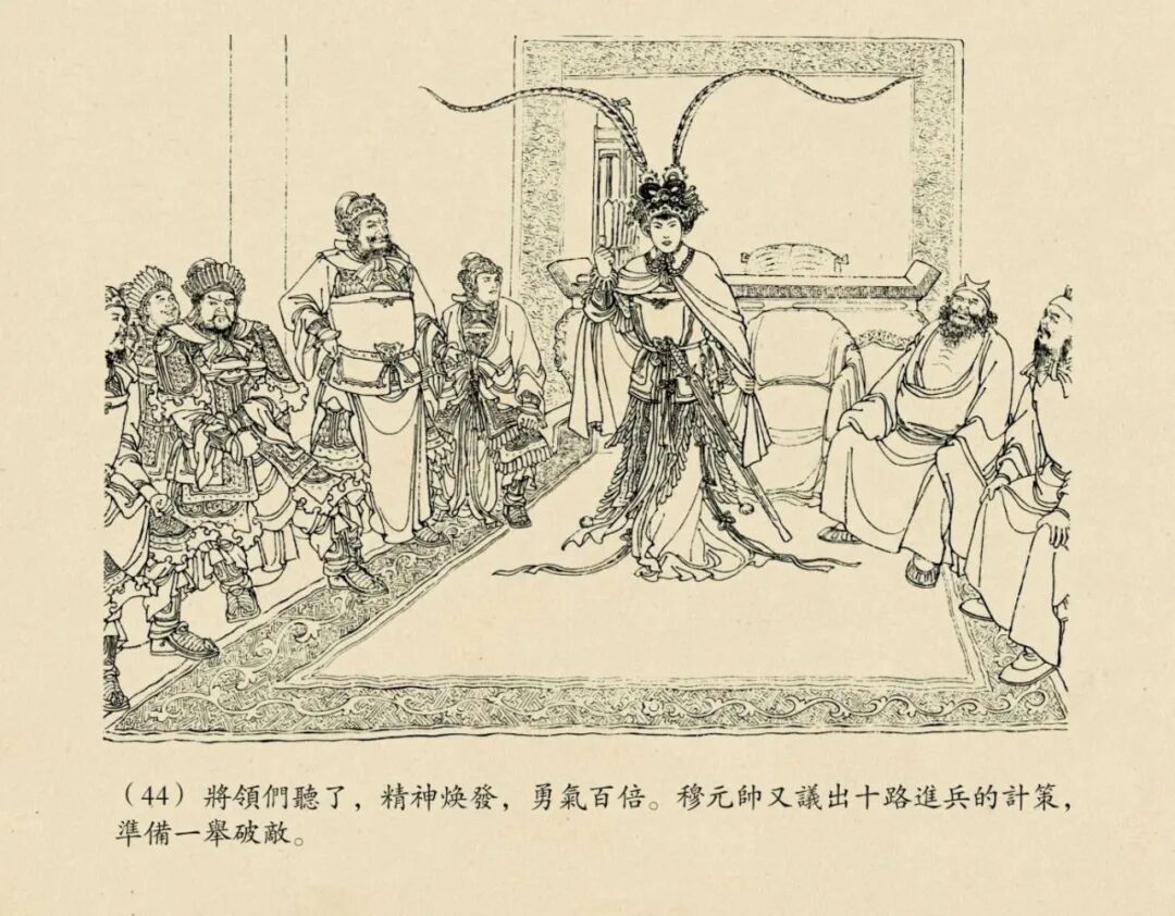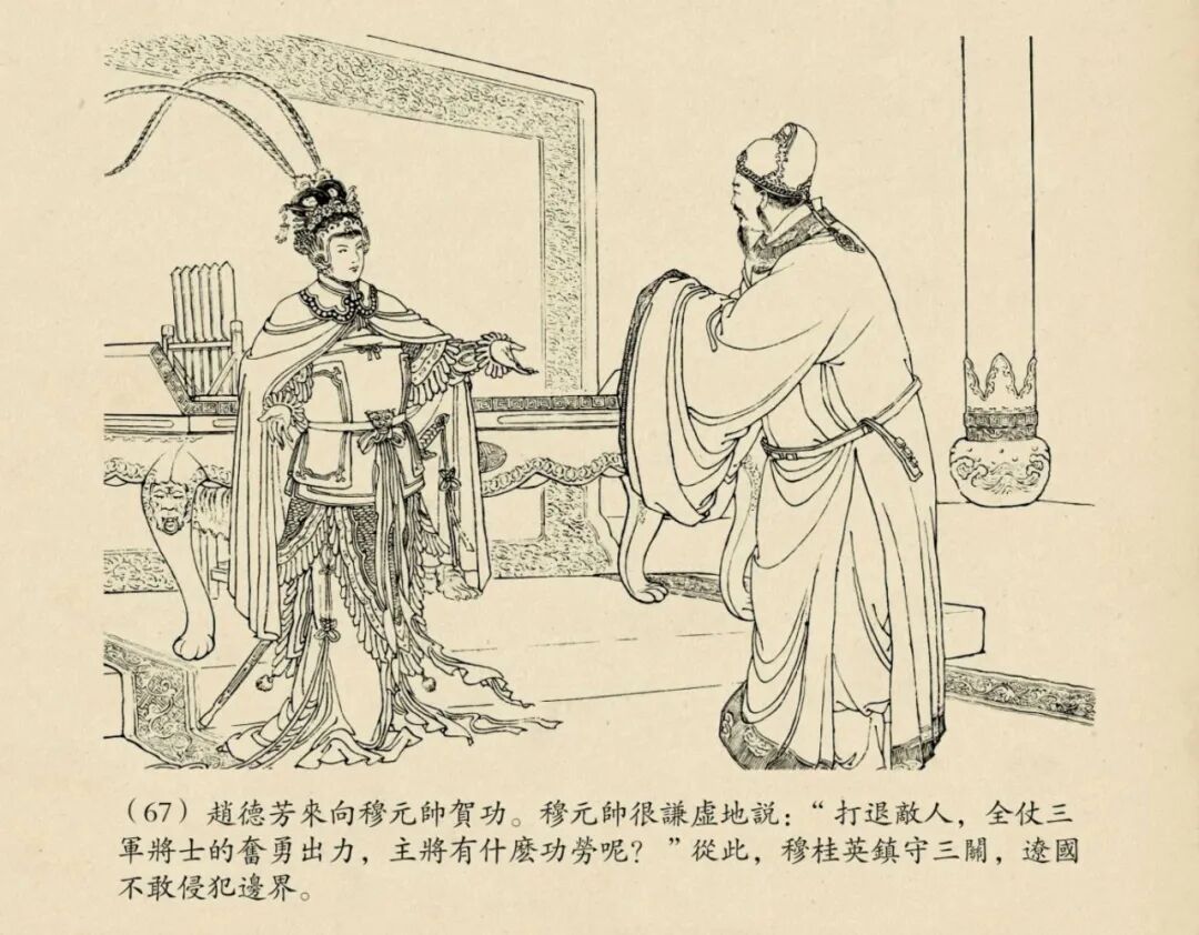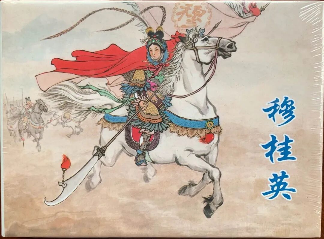 由于此书出色的造型艺术、精美流畅的线条,令广大读者深为叹服,因此《穆桂英》一经出版便备受读者追捧,纷纷争相抢购,甚至出现了一书难求的局面。所以上美社将此书上、下两册合并为一册后多次加印出版,并有了广大连友所熟知的“大刀”封面图。上美再版的50开小精装和32开大精装封面均采用了“大刀”图,而大32开宣纸版和16开英文版的封面则采用了“射箭”图。