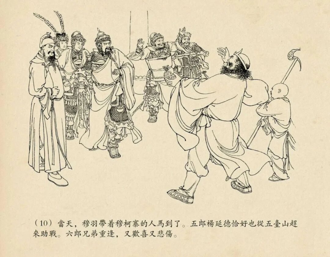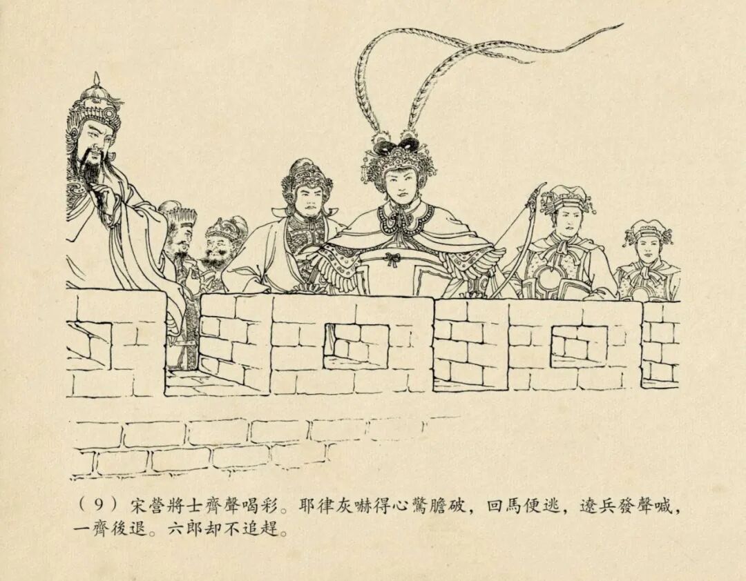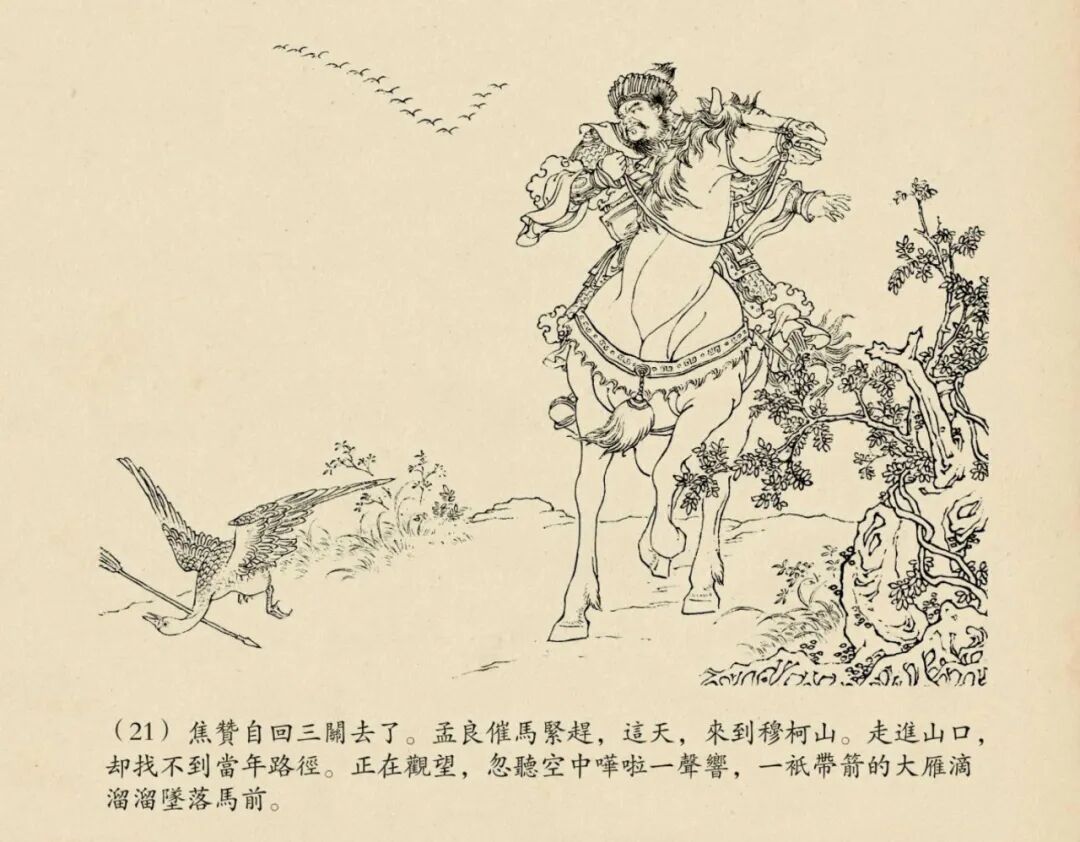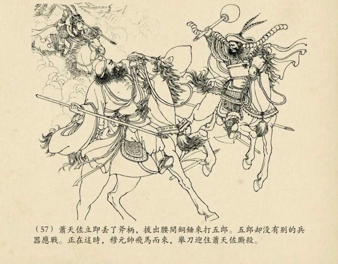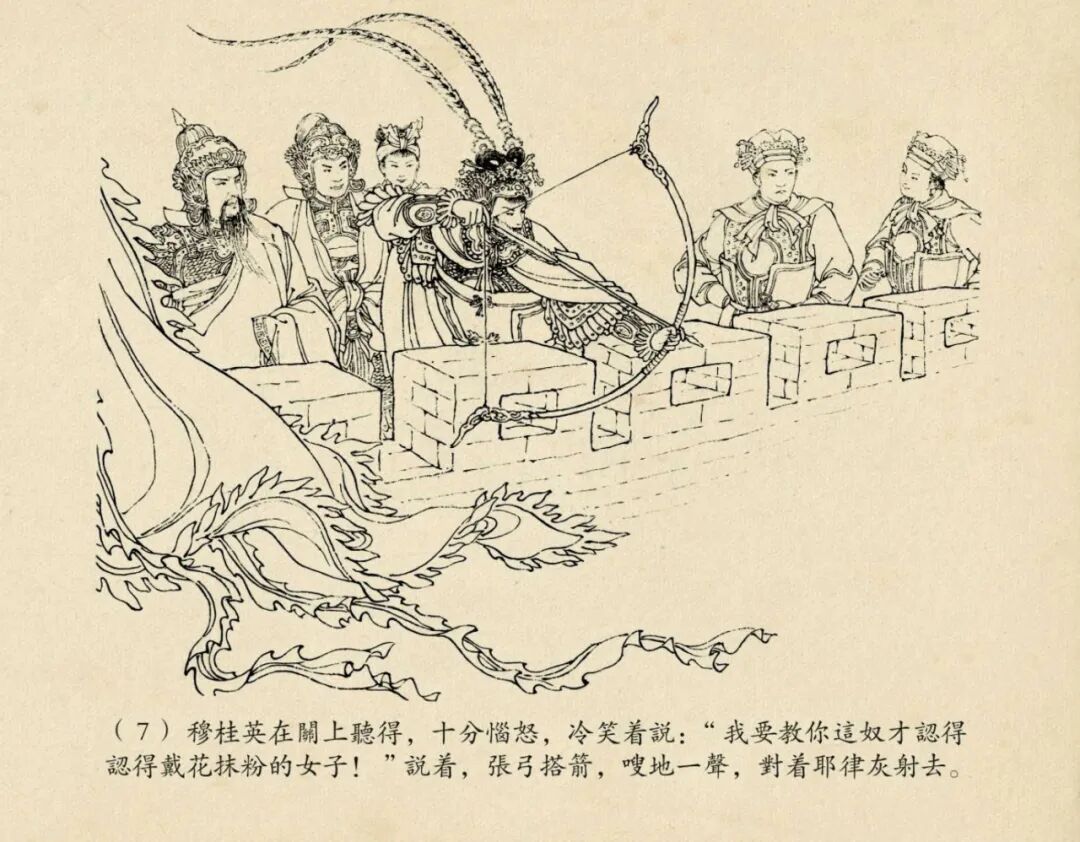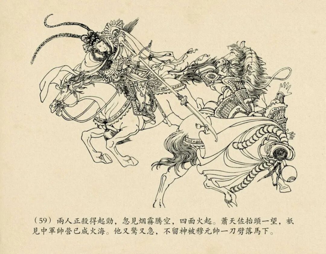 廖廖几笔就勾勒出马匹的肌肉线条,强劲有力;而马嘶声仿若耳畔,清晰可闻。敌将的盔甲笔笔精到,极富质感。那一箭就将护心镜射碎的雕翎箭,可见穆桂英箭法的高超精妙。