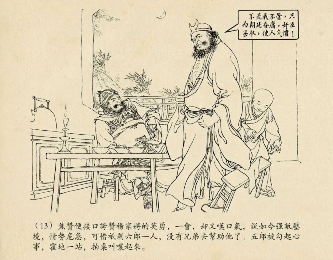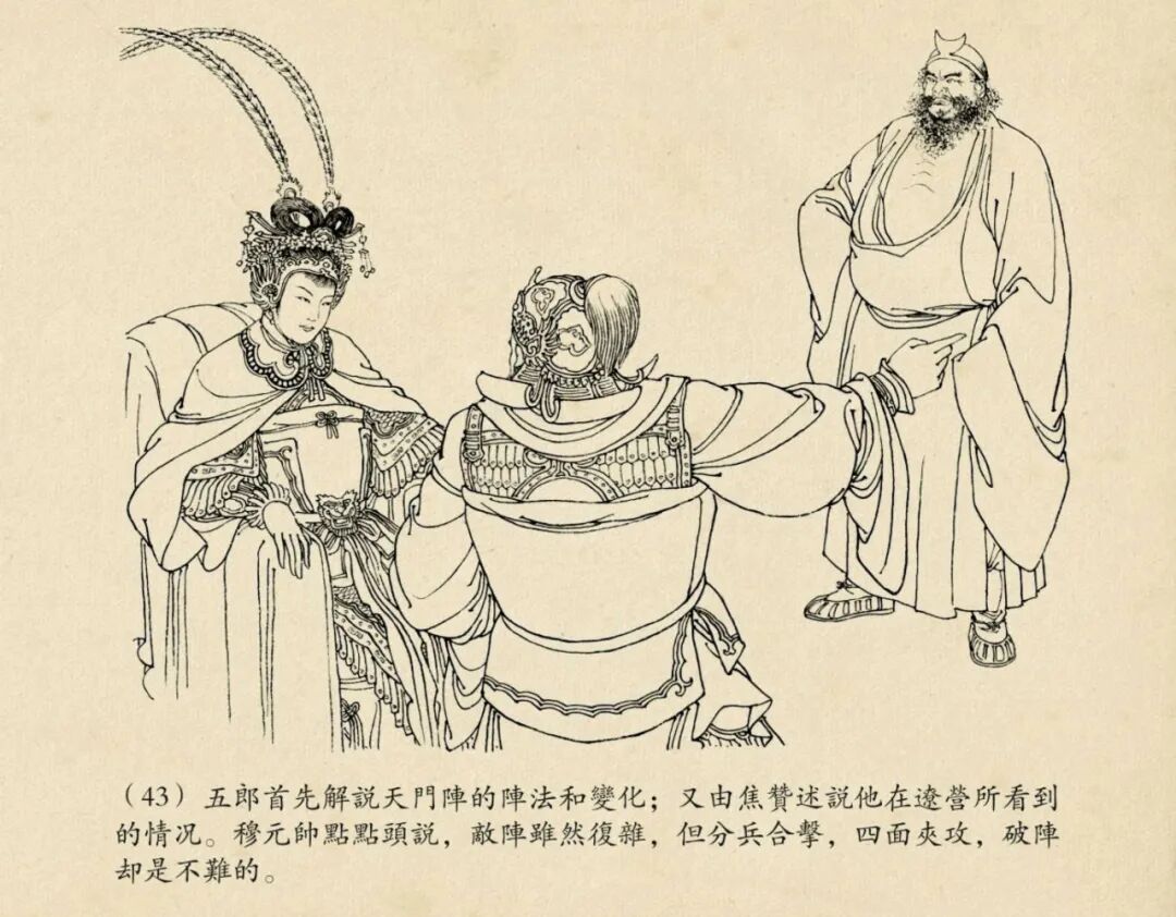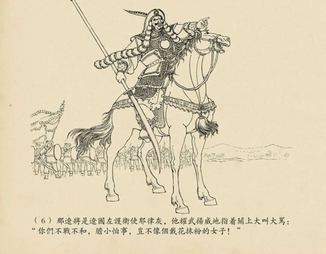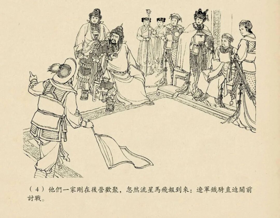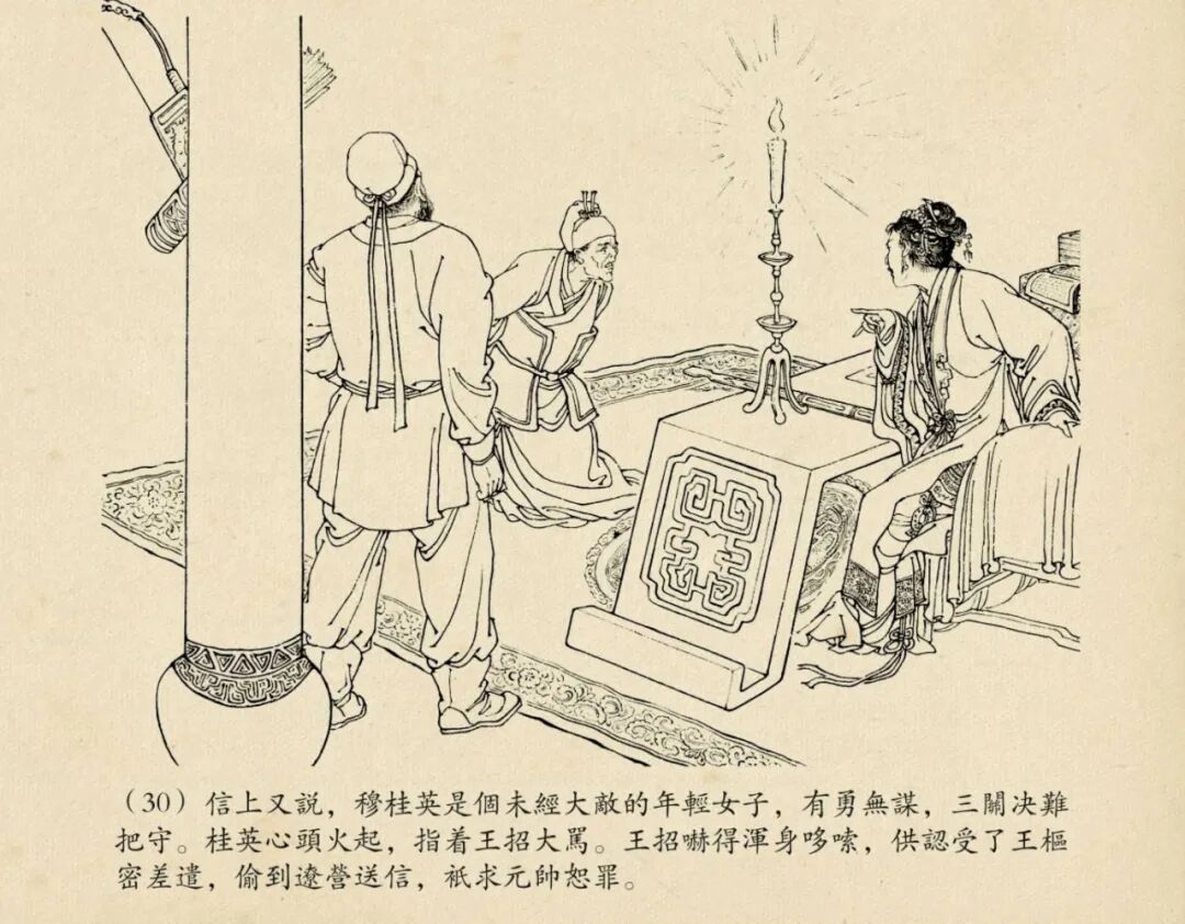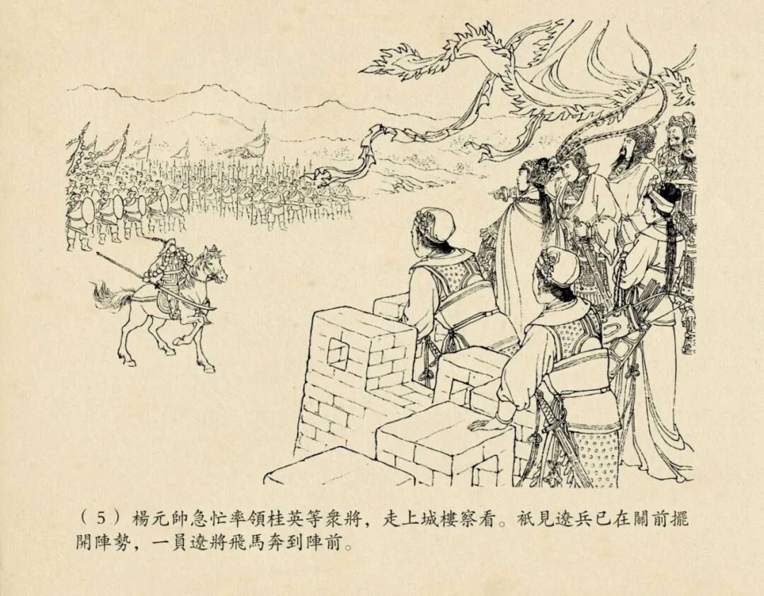 廖廖几笔就勾勒出马匹的肌肉线条,强劲有力;而马嘶声仿若耳畔,清晰可闻。敌将的盔甲笔笔精到,极富质感。那一箭就将护心镜射碎的雕翎箭,可见穆桂英箭法的高超精妙。