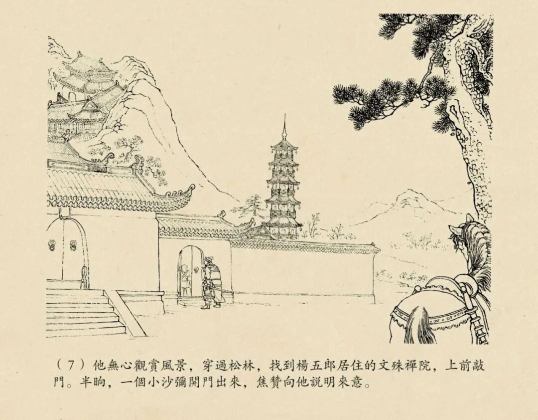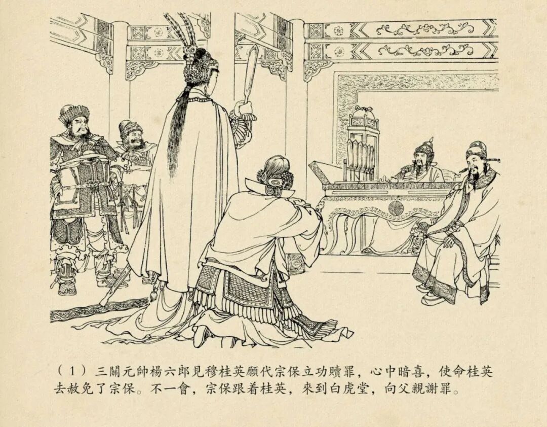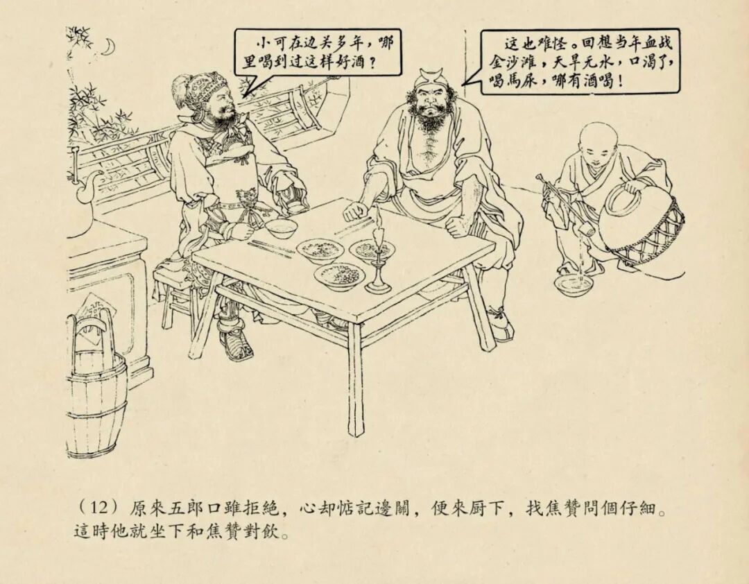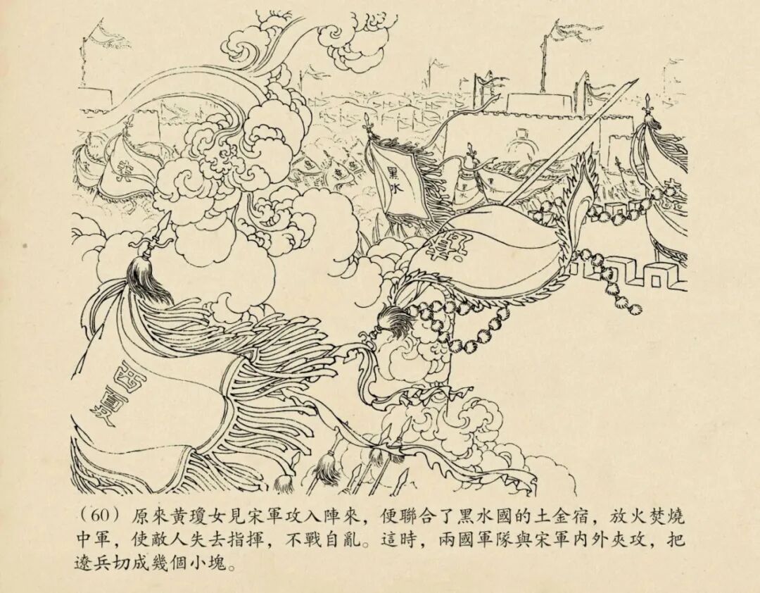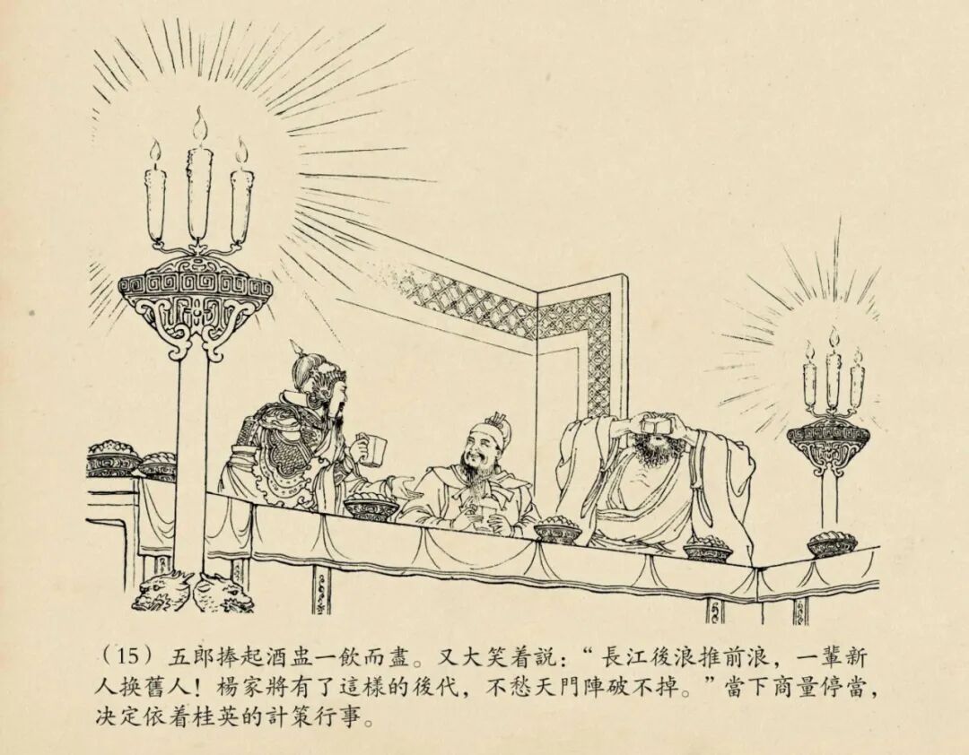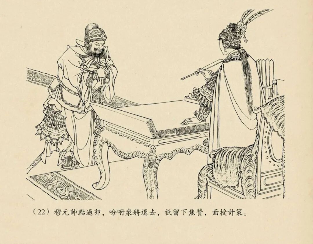 廖廖几笔就勾勒出马匹的肌肉线条,强劲有力;而马嘶声仿若耳畔,清晰可闻。敌将的盔甲笔笔精到,极富质感。那一箭就将护心镜射碎的雕翎箭,可见穆桂英箭法的高超精妙。