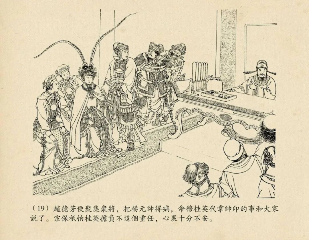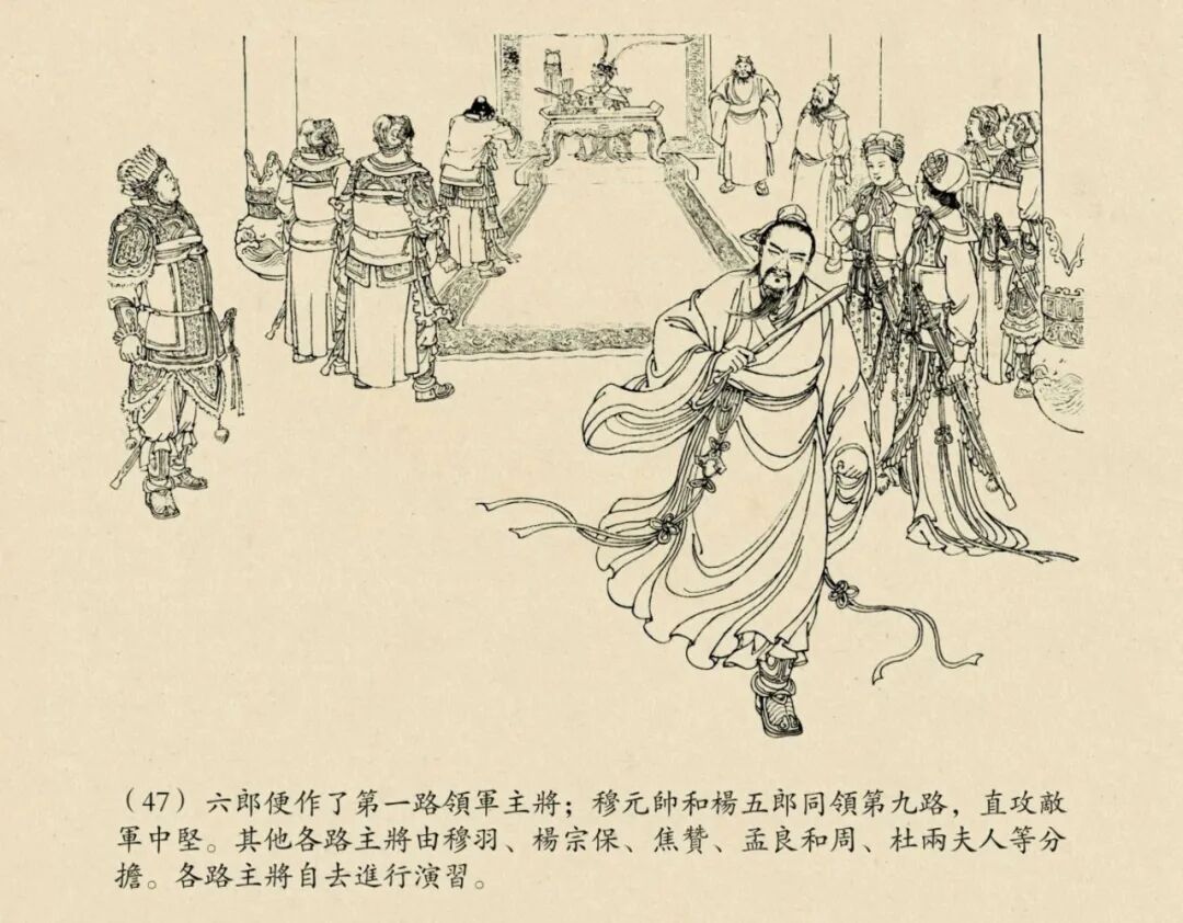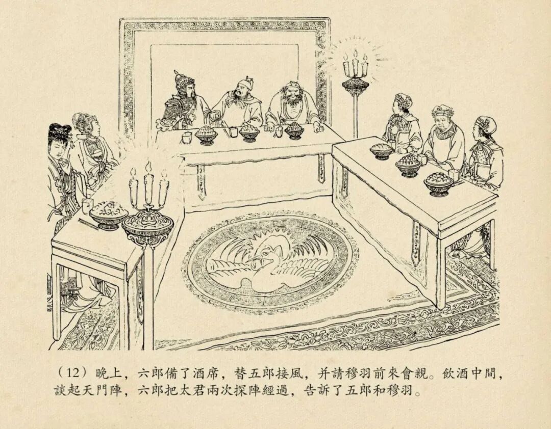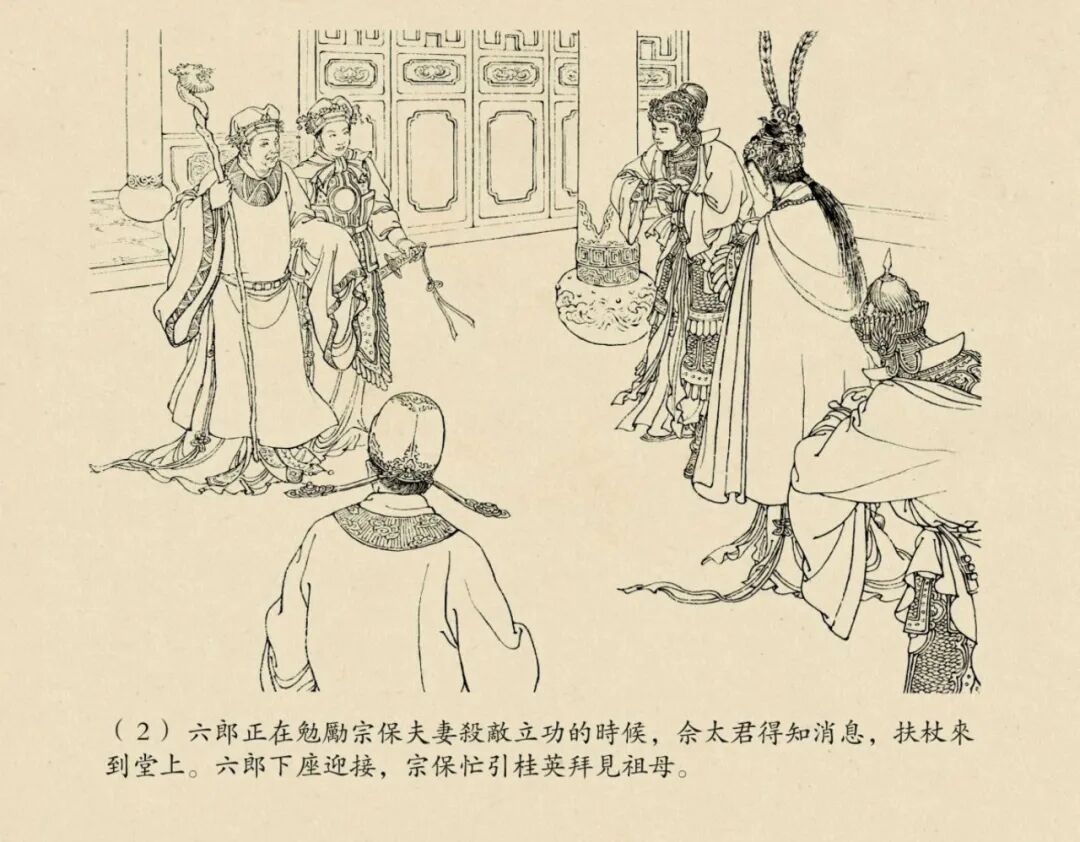 画面中六个人物动作、神态各异。穆桂英的欲说还休,将一个姑娘家的娇羞状表现得栩栩如生。后排最左侧的焦赞的动作、神态描绘的憨态可掬,煞是可爱。