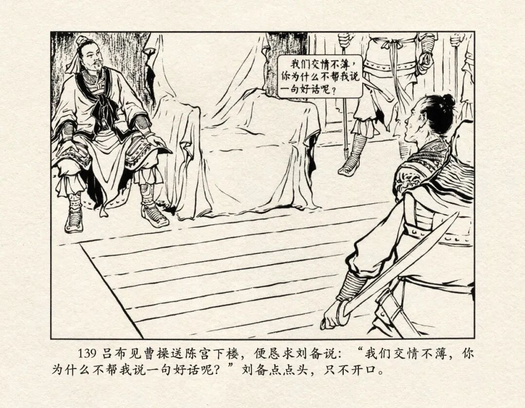 方操送宫下楼时,布告玄德曰:“公为坐上客,布为阶下囚,何不发一言而相宽乎?”——因为徐州问题,刘备与吕布已经交恶,吕布却还将自己的性命寄托到别人或者说是敌人的手中,这是非常致命的错误。