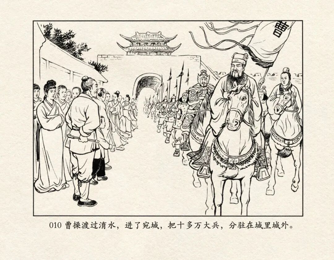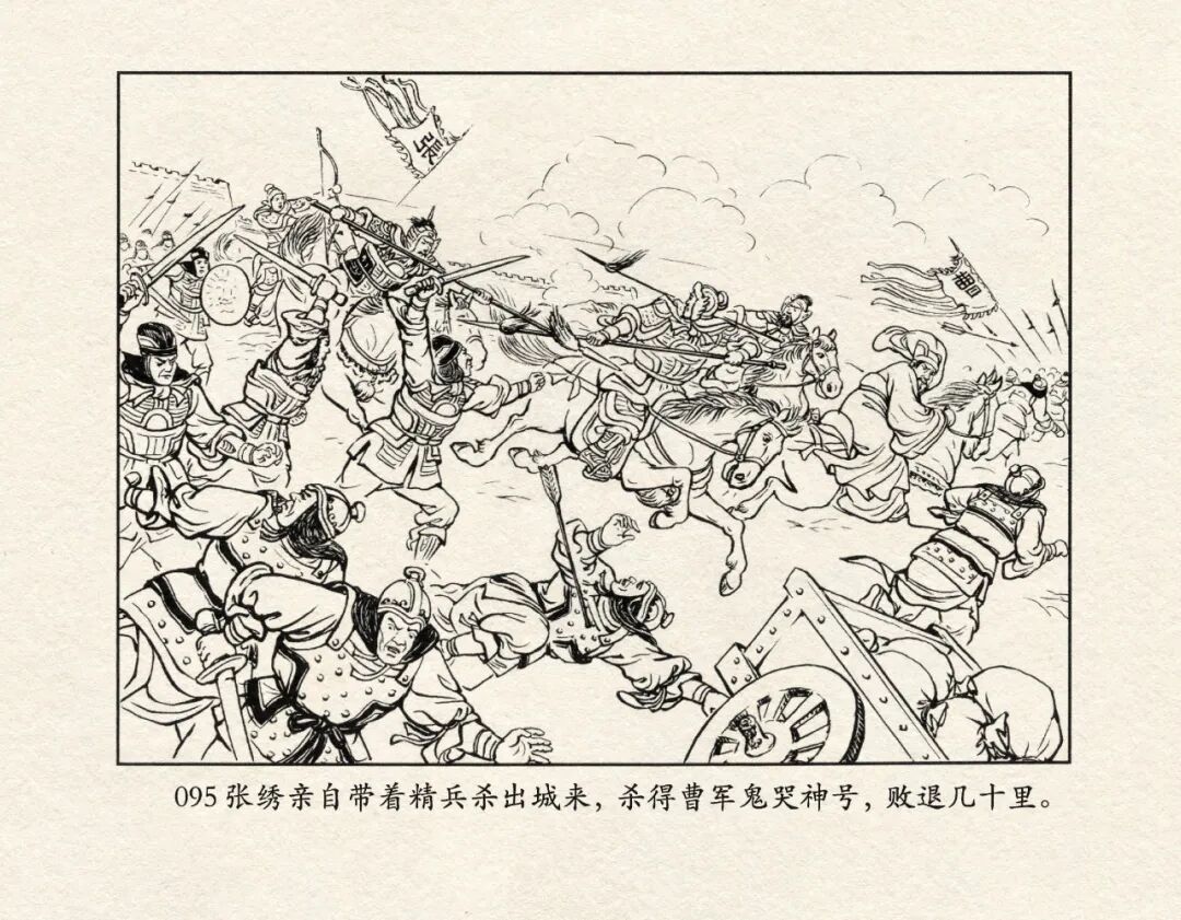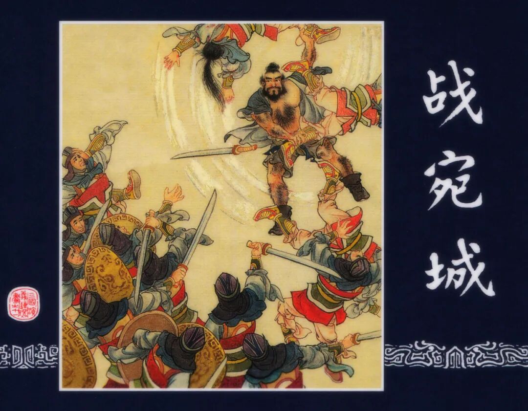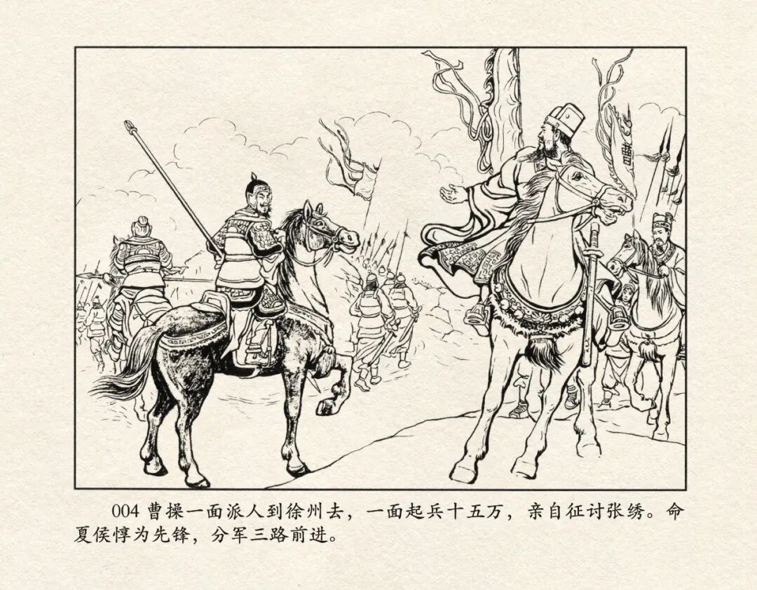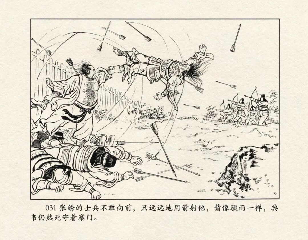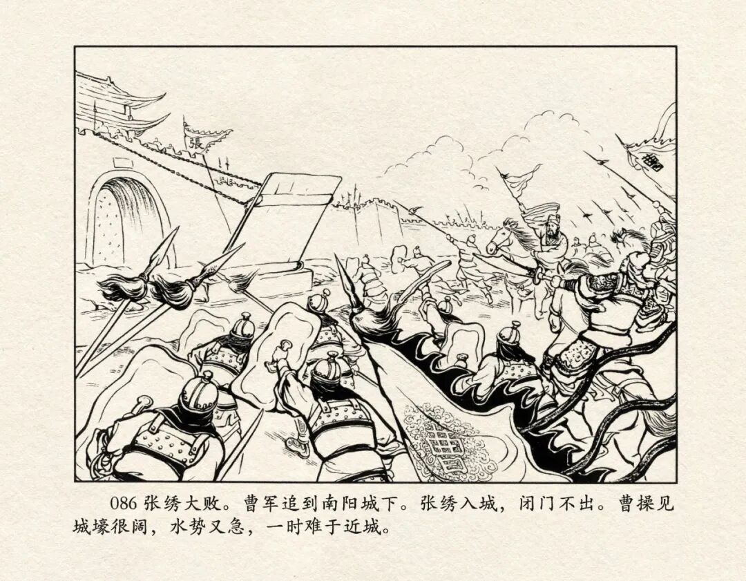 上集《辕门射戟》,叙吕布将画戟为标的,在一百五十步外射中戟上小支,以他的勇武劝止了袁术与刘备的战争。我在网上看了一下这批三国大精的图片,有《战宛城》这本画册。此书的绘制者是甘肃籍画家陈履平,他的名头虽然不及刘锡永、陈光镒、赵三岛等几位大师,但他也独立绘制了两本分册(《战宛城》和《兄弟争王》),水准不俗,特别是在构图造型,以及景物和人物的搭配上,颇显其深厚的功力。相关文章
