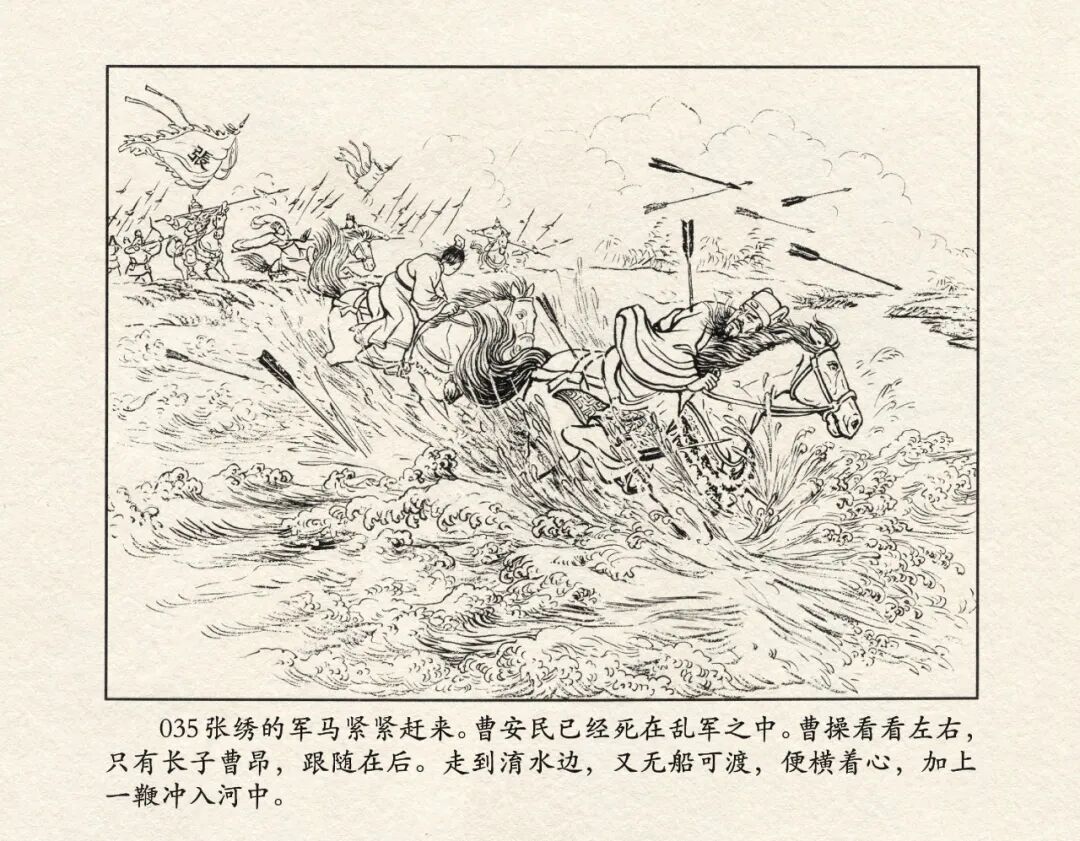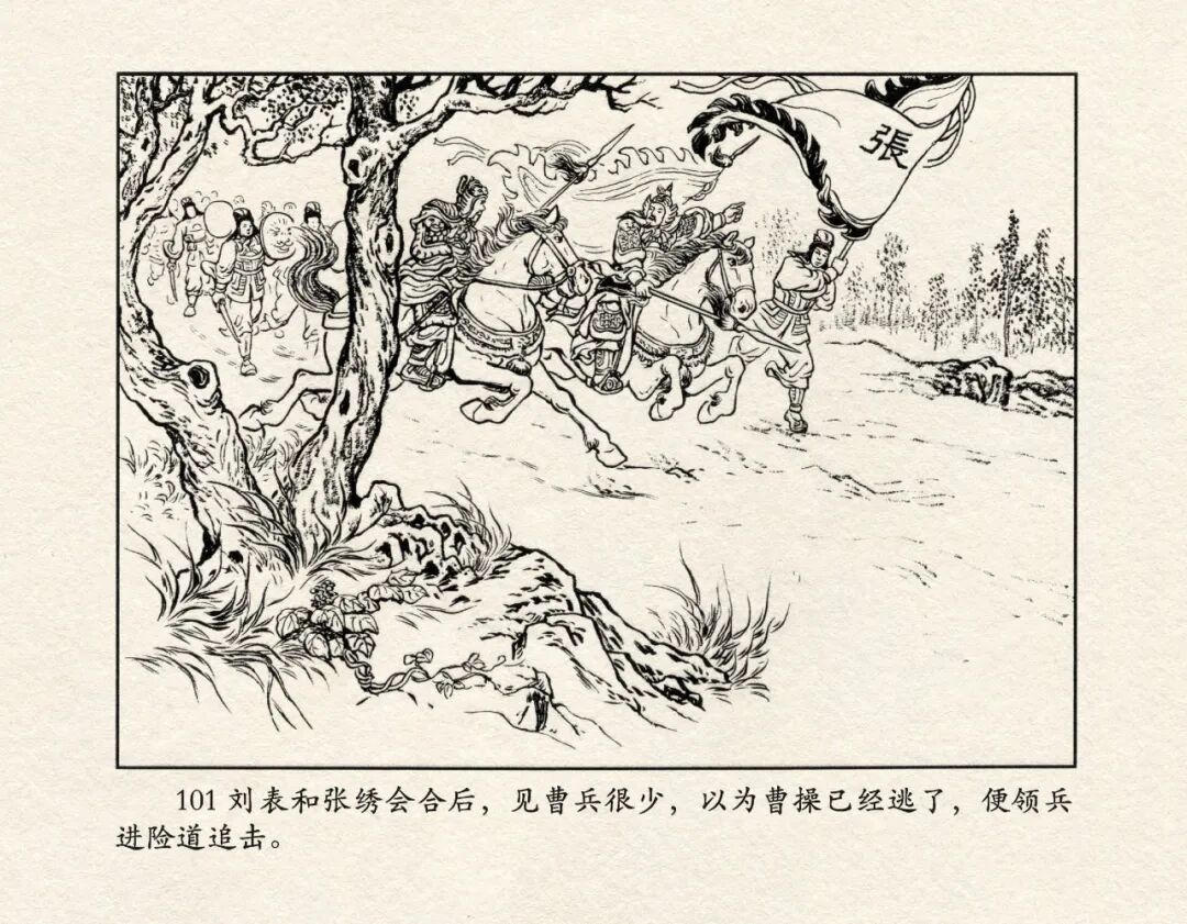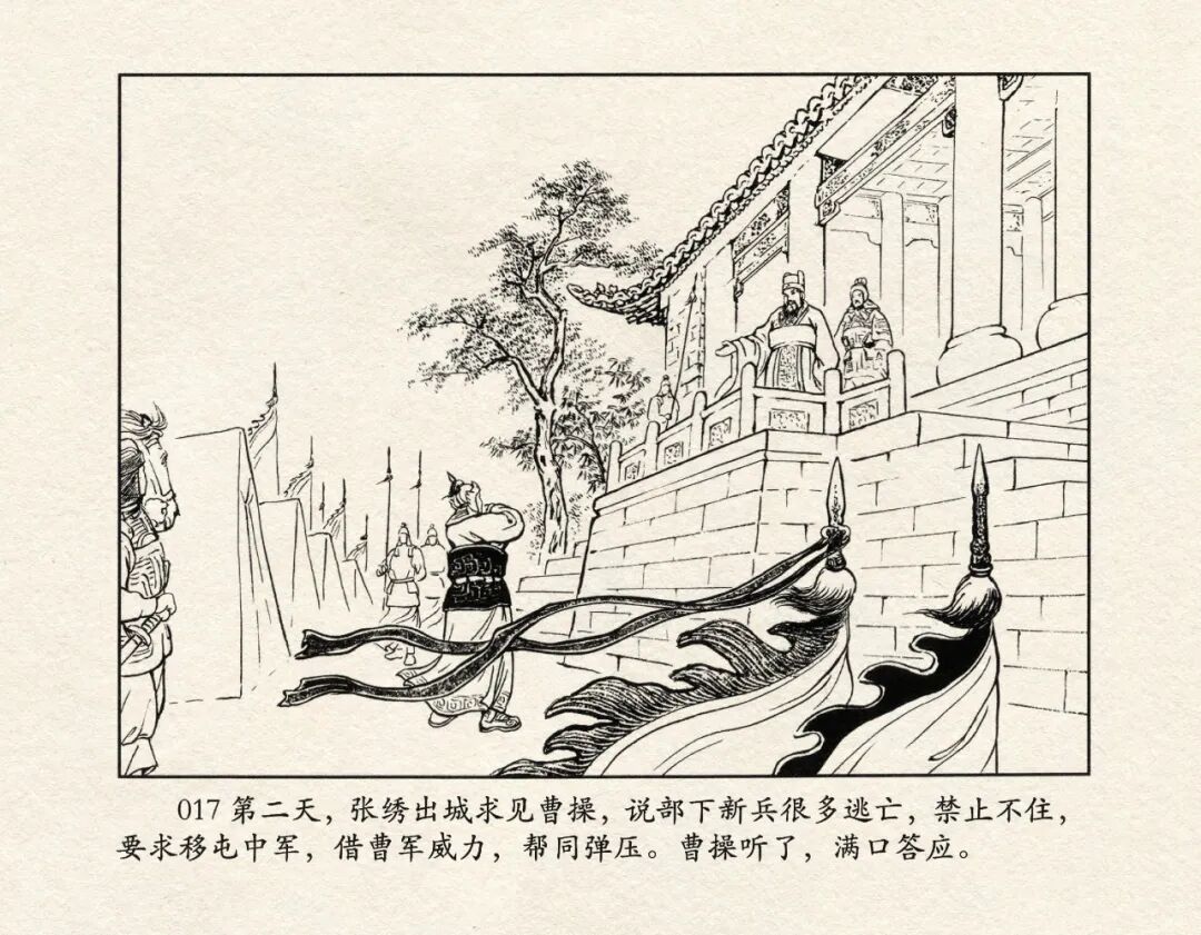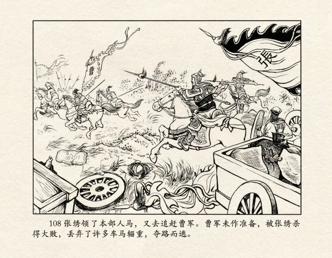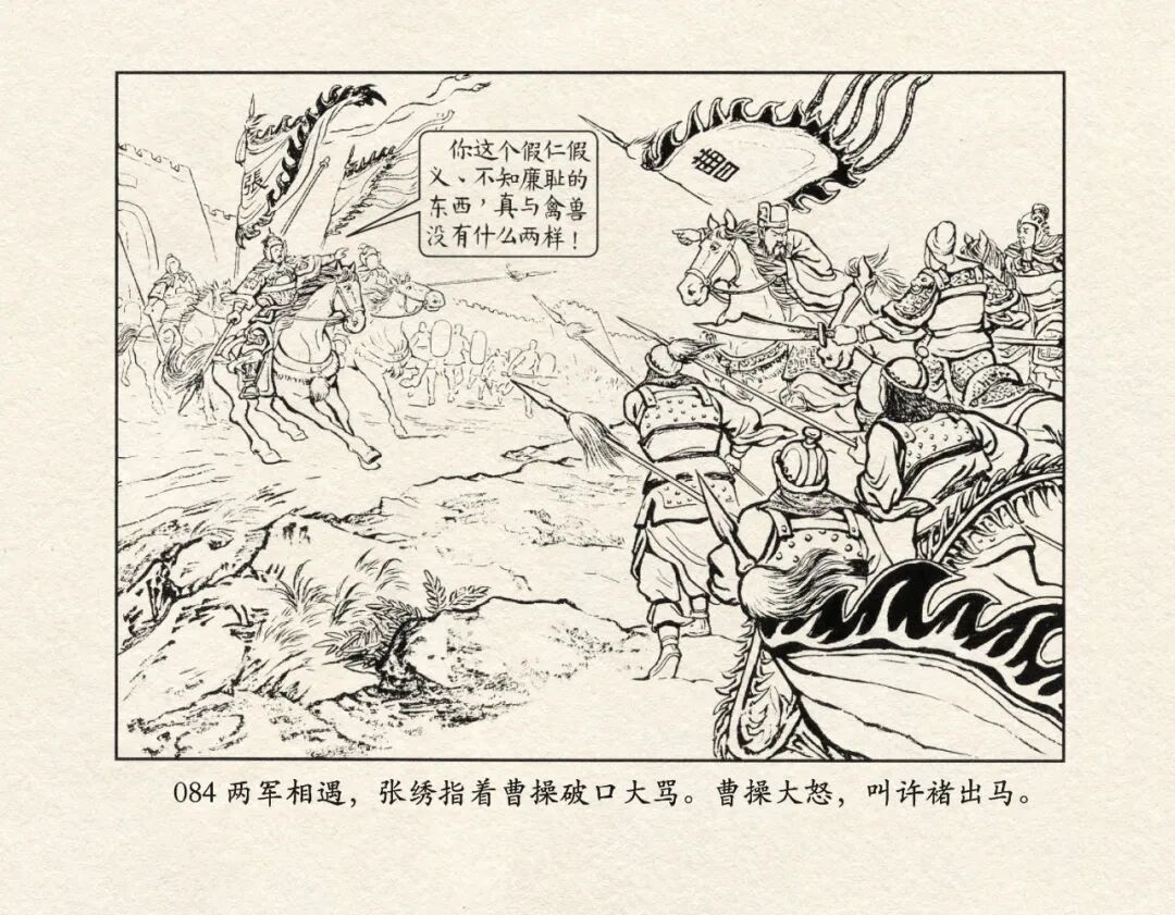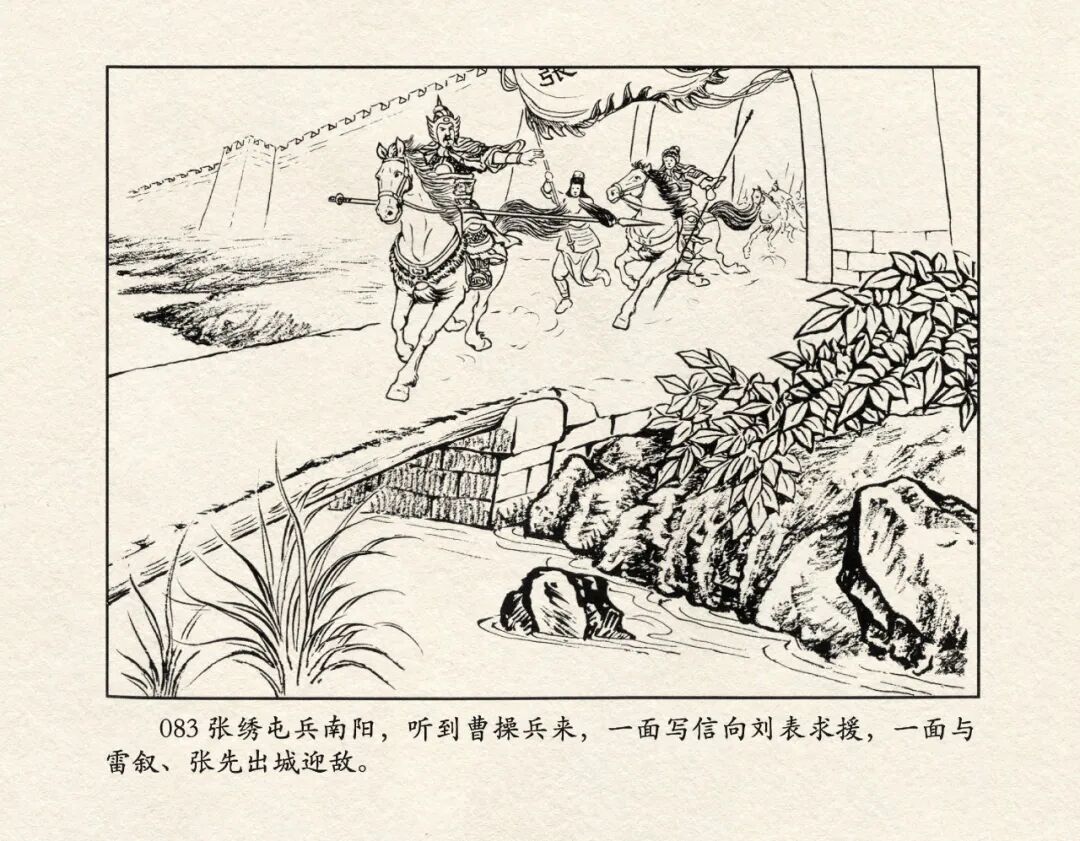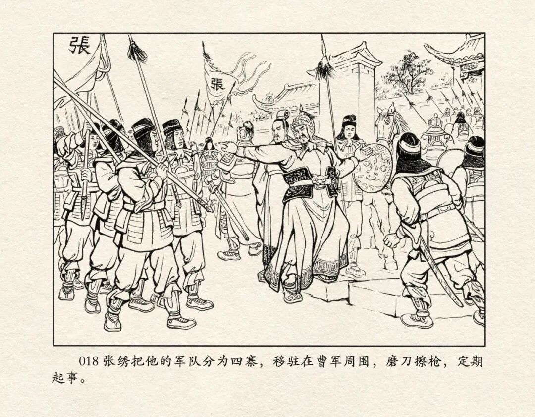 上集《辕门射戟》,叙吕布将画戟为标的,在一百五十步外射中戟上小支,以他的勇武劝止了袁术与刘备的战争。我在网上看了一下这批三国大精的图片,有《战宛城》这本画册。此书的绘制者是甘肃籍画家陈履平,他的名头虽然不及刘锡永、陈光镒、赵三岛等几位大师,但他也独立绘制了两本分册(《战宛城》和《兄弟争王》),水准不俗,特别是在构图造型,以及景物和人物的搭配上,颇显其深厚的功力。相关文章