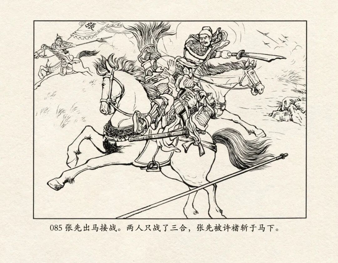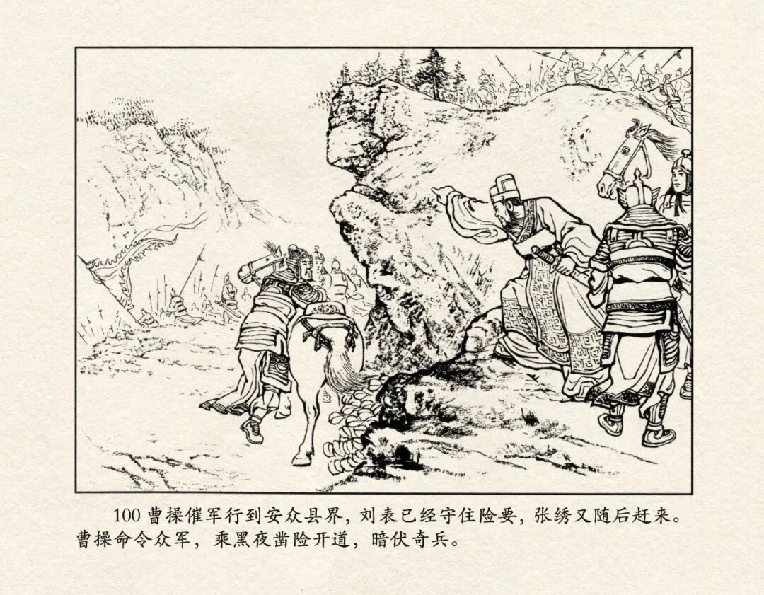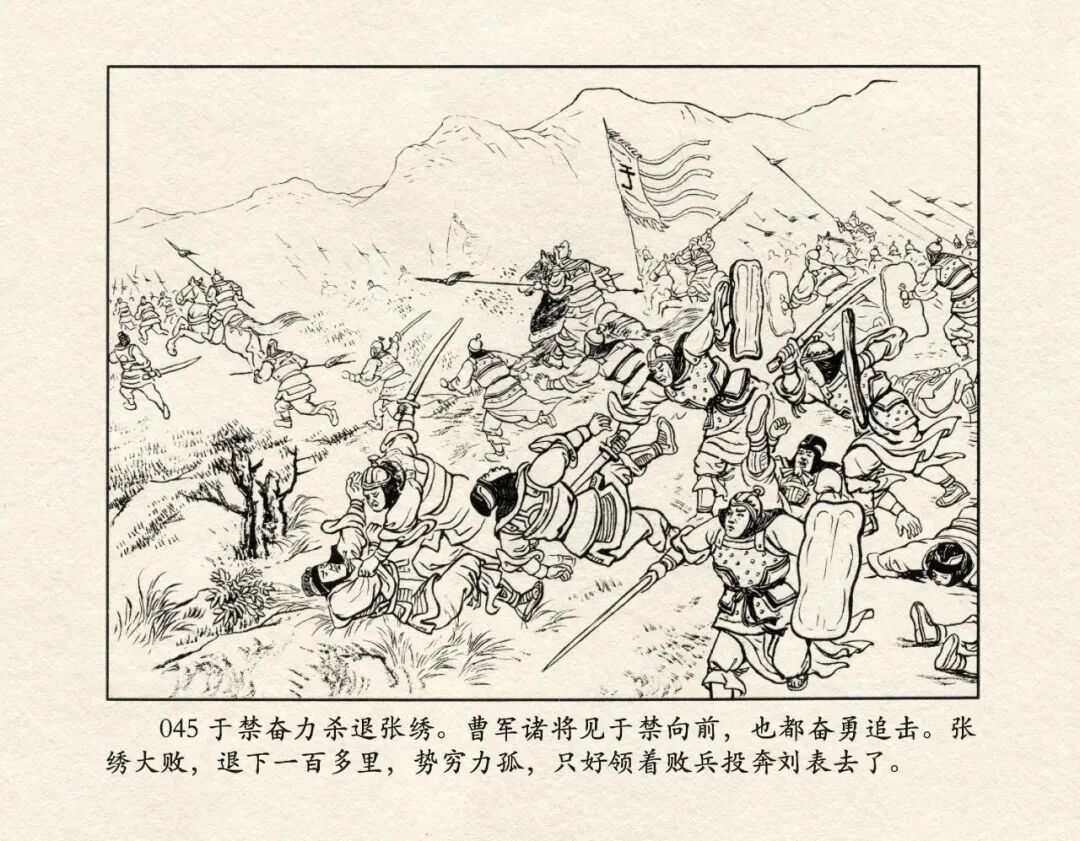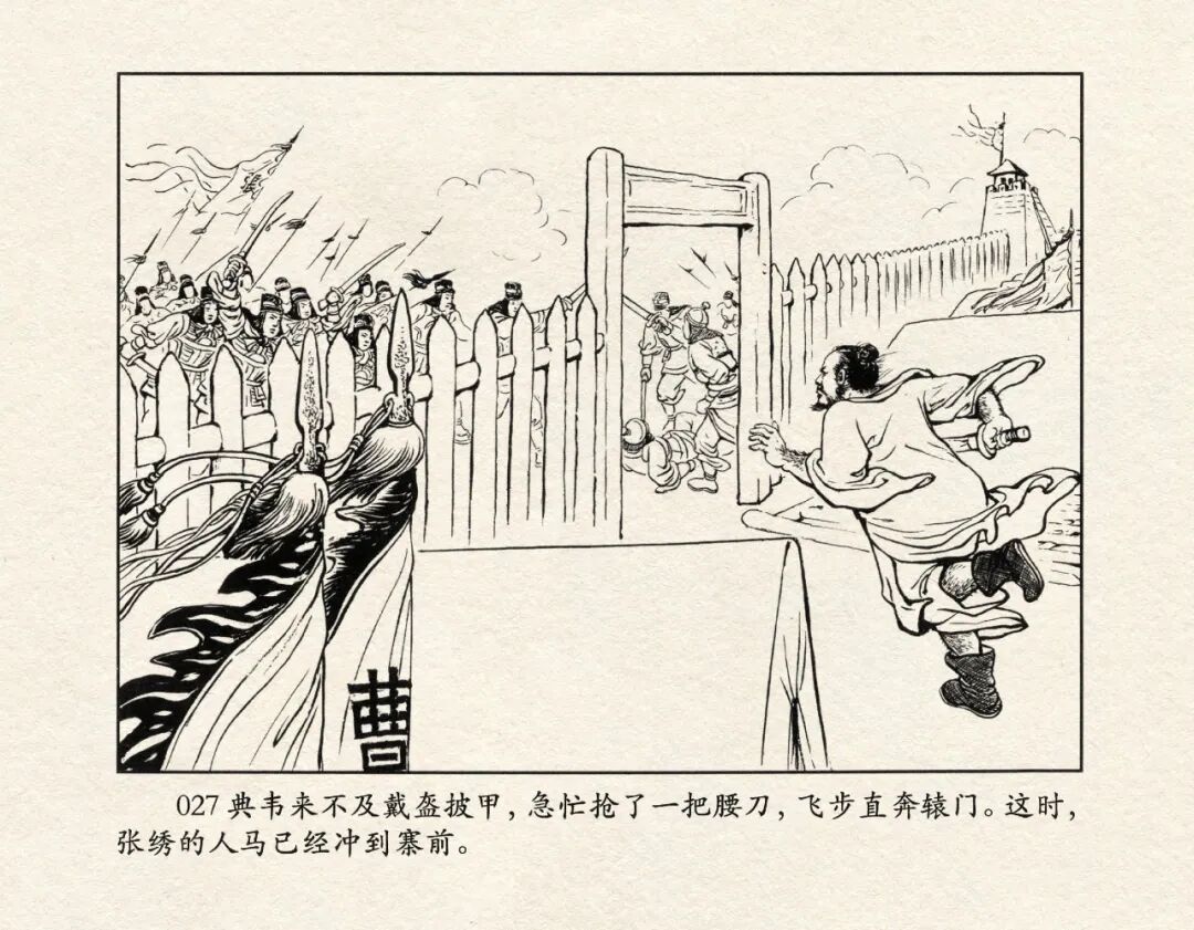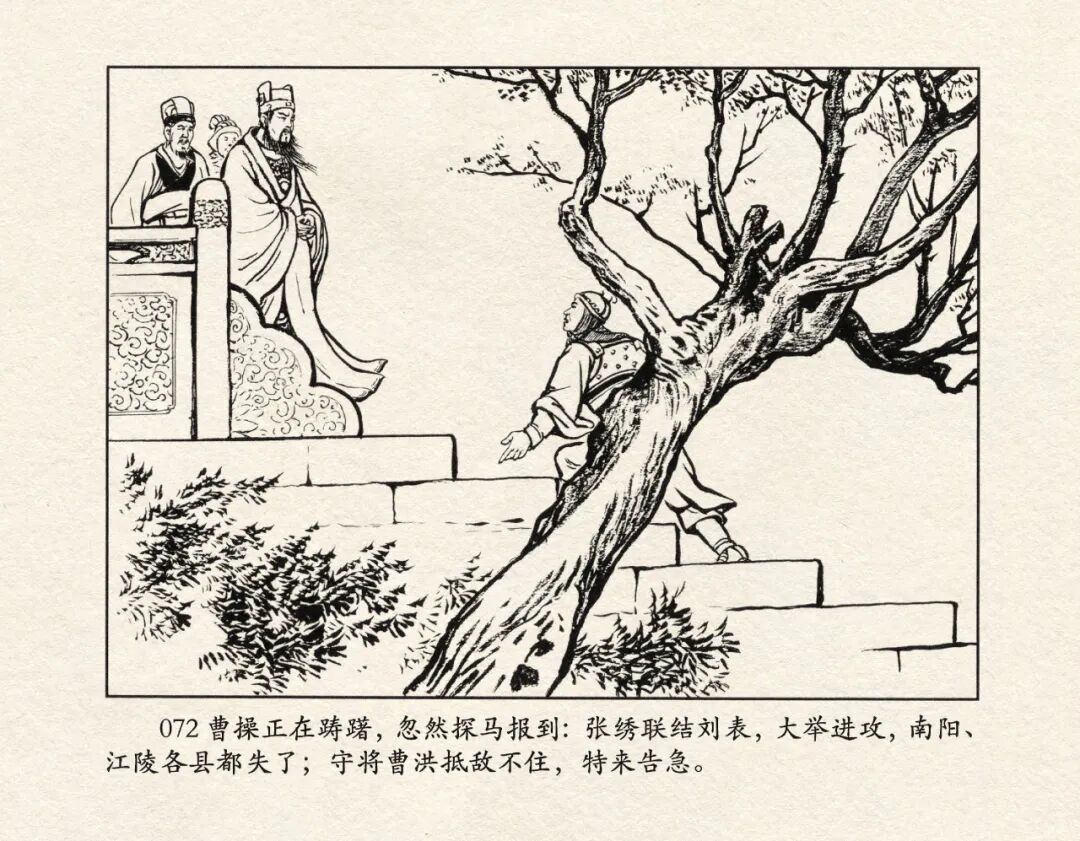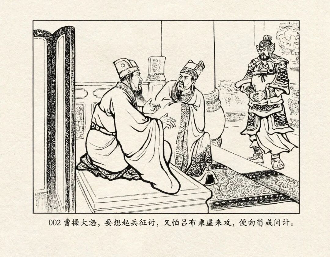 上集《辕门射戟》,叙吕布将画戟为标的,在一百五十步外射中戟上小支,以他的勇武劝止了袁术与刘备的战争。我在网上看了一下这批三国大精的图片,有《战宛城》这本画册。此书的绘制者是甘肃籍画家陈履平,他的名头虽然不及刘锡永、陈光镒、赵三岛等几位大师,但他也独立绘制了两本分册(《战宛城》和《兄弟争王》),水准不俗,特别是在构图造型,以及景物和人物的搭配上,颇显其深厚的功力。相关文章