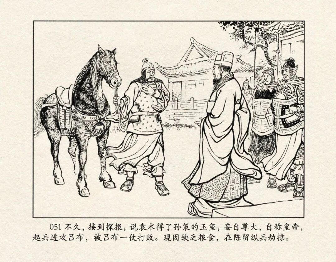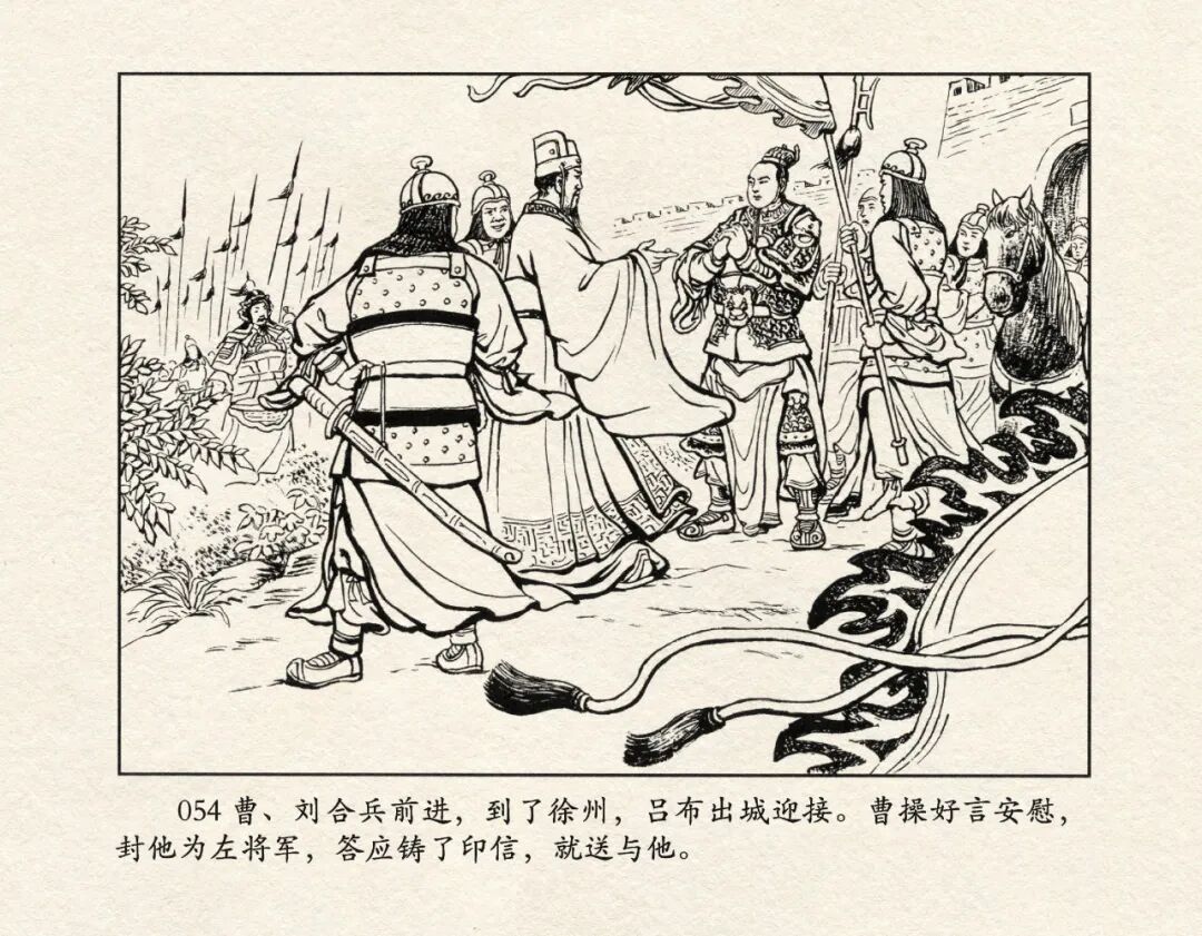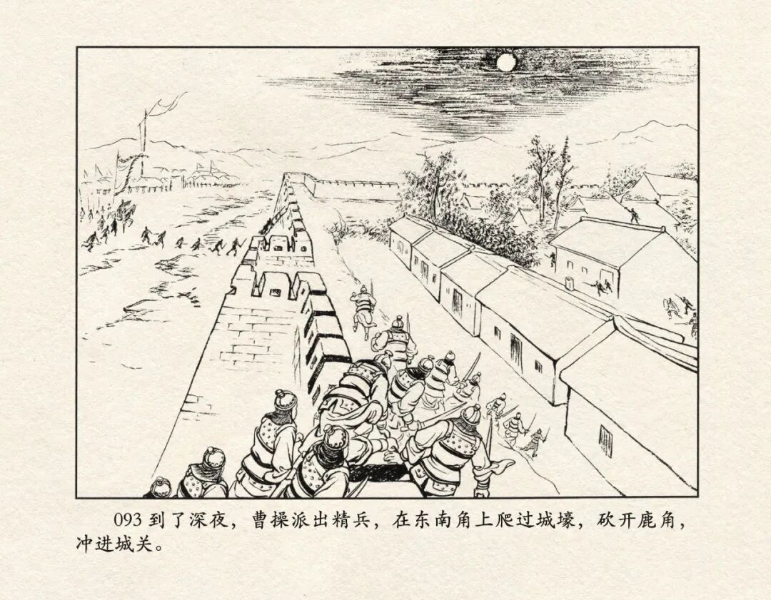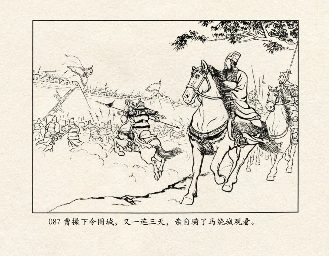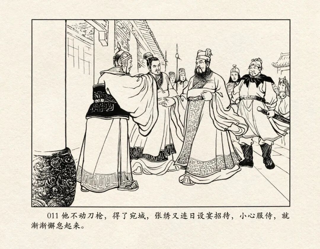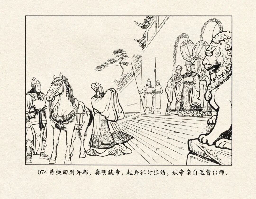 上集《辕门射戟》,叙吕布将画戟为标的,在一百五十步外射中戟上小支,以他的勇武劝止了袁术与刘备的战争。我在网上看了一下这批三国大精的图片,有《战宛城》这本画册。此书的绘制者是甘肃籍画家陈履平,他的名头虽然不及刘锡永、陈光镒、赵三岛等几位大师,但他也独立绘制了两本分册(《战宛城》和《兄弟争王》),水准不俗,特别是在构图造型,以及景物和人物的搭配上,颇显其深厚的功力。相关文章