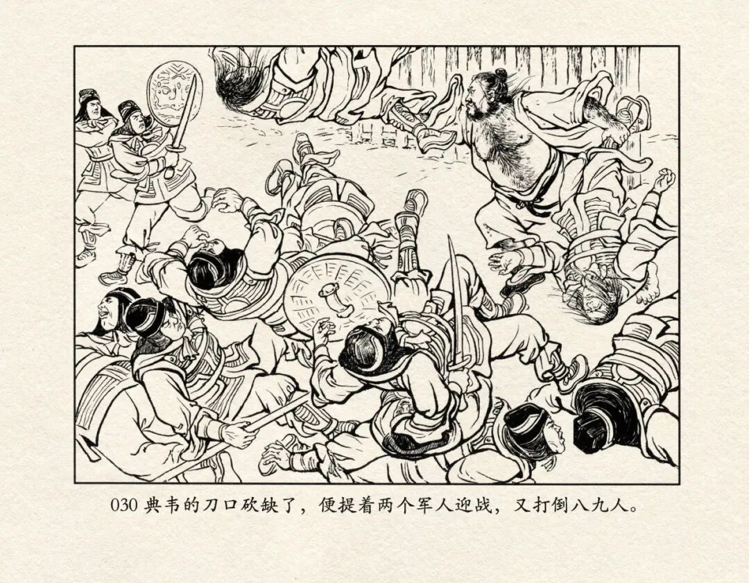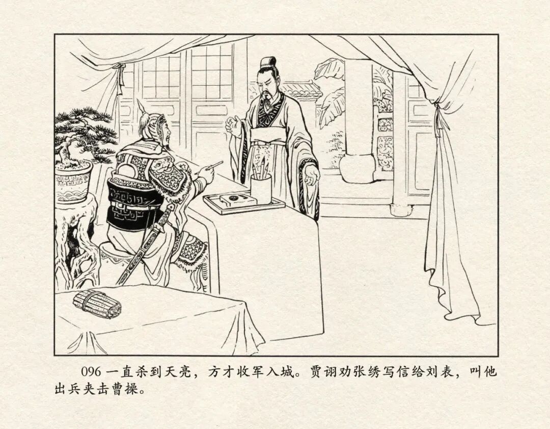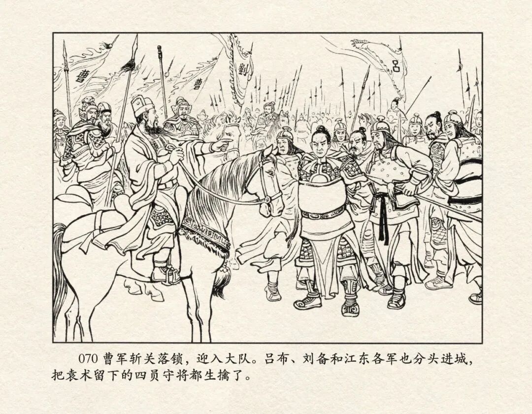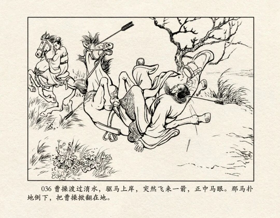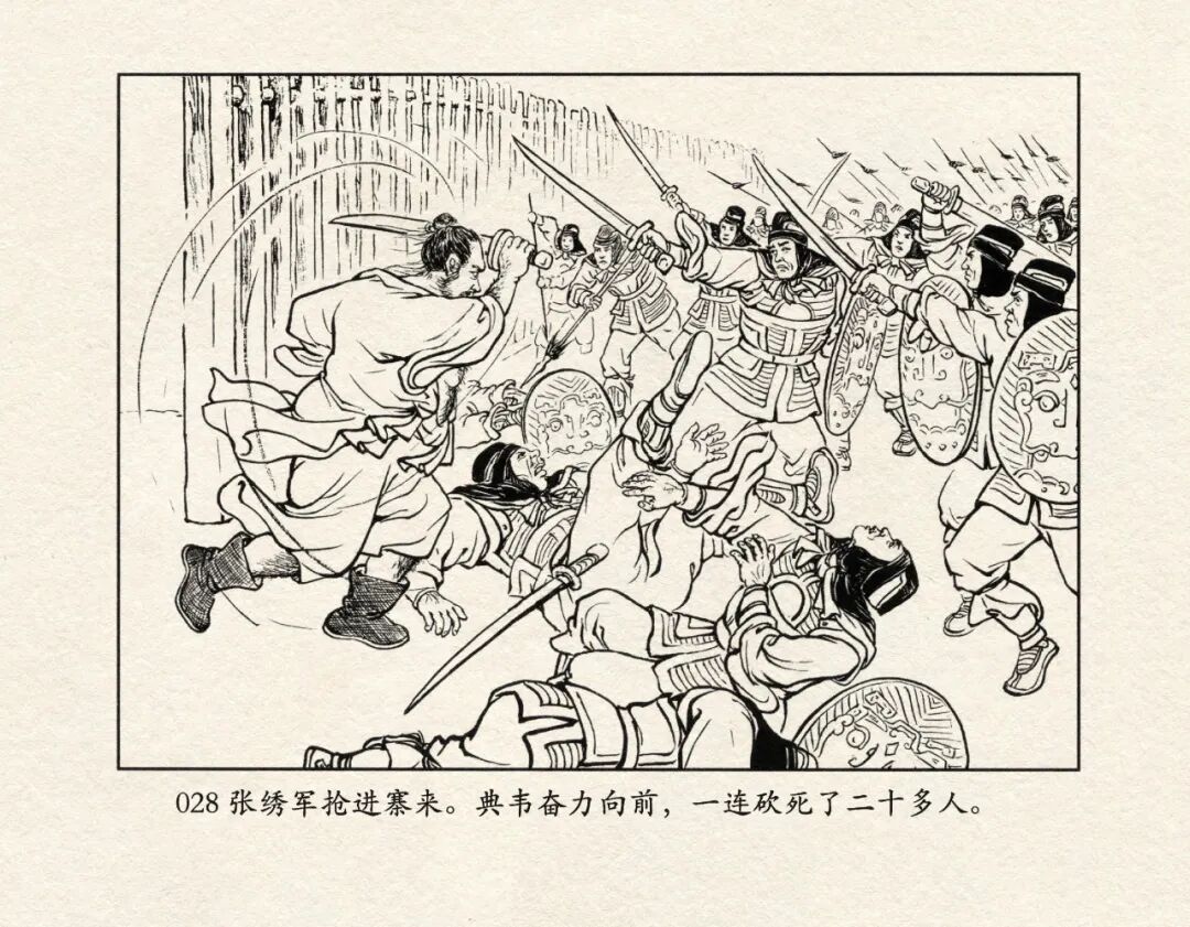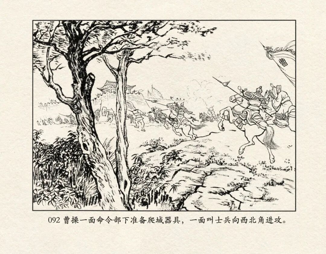 上集《辕门射戟》,叙吕布将画戟为标的,在一百五十步外射中戟上小支,以他的勇武劝止了袁术与刘备的战争。我在网上看了一下这批三国大精的图片,有《战宛城》这本画册。此书的绘制者是甘肃籍画家陈履平,他的名头虽然不及刘锡永、陈光镒、赵三岛等几位大师,但他也独立绘制了两本分册(《战宛城》和《兄弟争王》),水准不俗,特别是在构图造型,以及景物和人物的搭配上,颇显其深厚的功力。相关文章