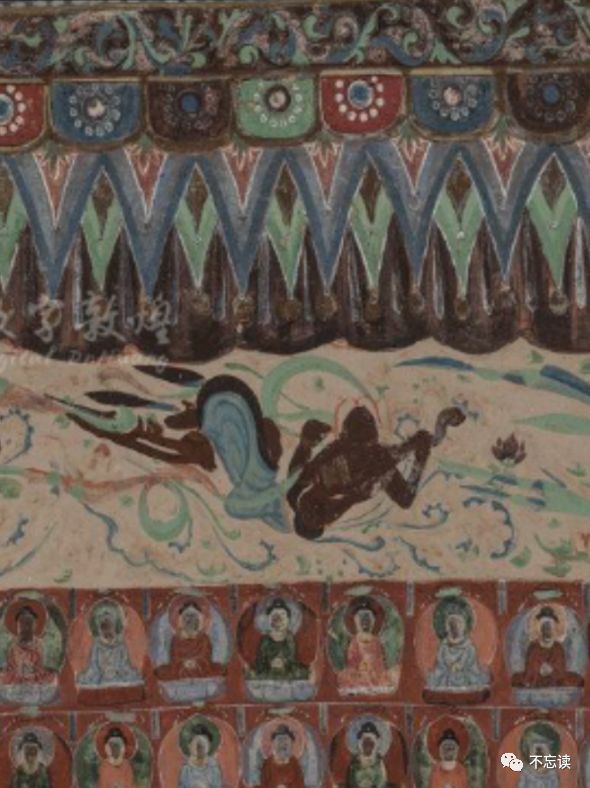 初唐329窟是我们参观的第三个窟,先写窟顶是因为,一抬头就是我最最喜欢的藻井。飞天莲花无穷碧,长巾飘摇别样仙。 莲花井心,圆心莲蓬白色莲籽,接14片卷瓣莲,蓝红绿相间成趣;围14朵卷云纹,层叠叠大放光芒;像旋转的五色法轮一样,夺目异彩。莲花是佛法里重要的宝物,人们可以在莲花中再生,可以通过莲花进入西方极乐世界。“莲花妙宝为璎珞,处处庄严净无垢,香水澄淳具众色,宝华旋布放光明”是《华严经》里对莲花的描述,莫高窟的画师们就是带着对佛经的理解、对佛法的虔诚,将文字“翻译”成精美的画面,展示给普通民众,带领自己引领他人,走向佛法的圣地。 莲花周围碧蓝荡漾,像湛蓝的天空,似浩瀚的海洋,四位飞天,长衣薄带,围绕莲花婀娜飞翔。 展转腾挪是她们的轻盈,衣巾飘飘是她们的曼妙。 右侧飞天举手展腰,舞姿翩跹若惊鸿。 上侧飞天好像鹞子翻身鱼跃龙门。 下侧飞天宛若仙女闲雅飘逸。 不提佛法,光是这如仙似幻的美,就足以引人入胜。