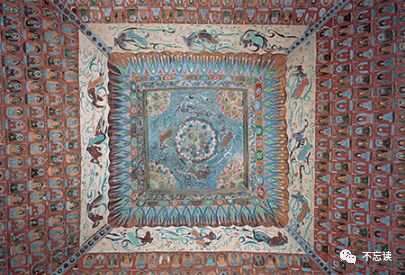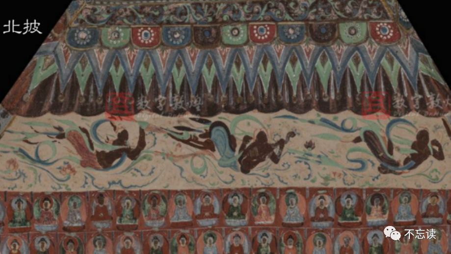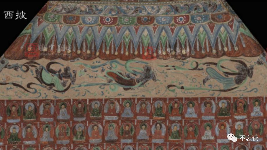 光有美好的井心还不够,作为方形覆斗顶,拱卫井心的四披,一样精美绝伦。鲜艳飘逸的花纹垂缦,绕顶飞翔的飞天,布满四披的千佛,无不体现着佛法世界的美妙与庄严。