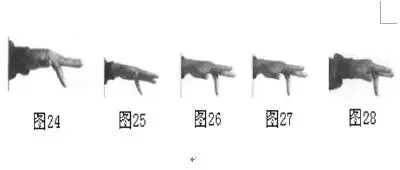 两手放平,掌心朝下,手指放松伸直(此时脚趾亦同时放松),屈食指指掌关节(指间关节伸直),慢慢地压下食指(下压过程要尽可能地做到慢、舒、缓);停约7秒钟后,食指慢慢抬至略高于原位后停1~2秒钟,再做下一次,直到完成规定次数,手指复原。然后,再用此方法依次扳动其他各指(图24~图28)。五指均扳过一遍,再继续马步站桩5分钟左右即可做收势收功。