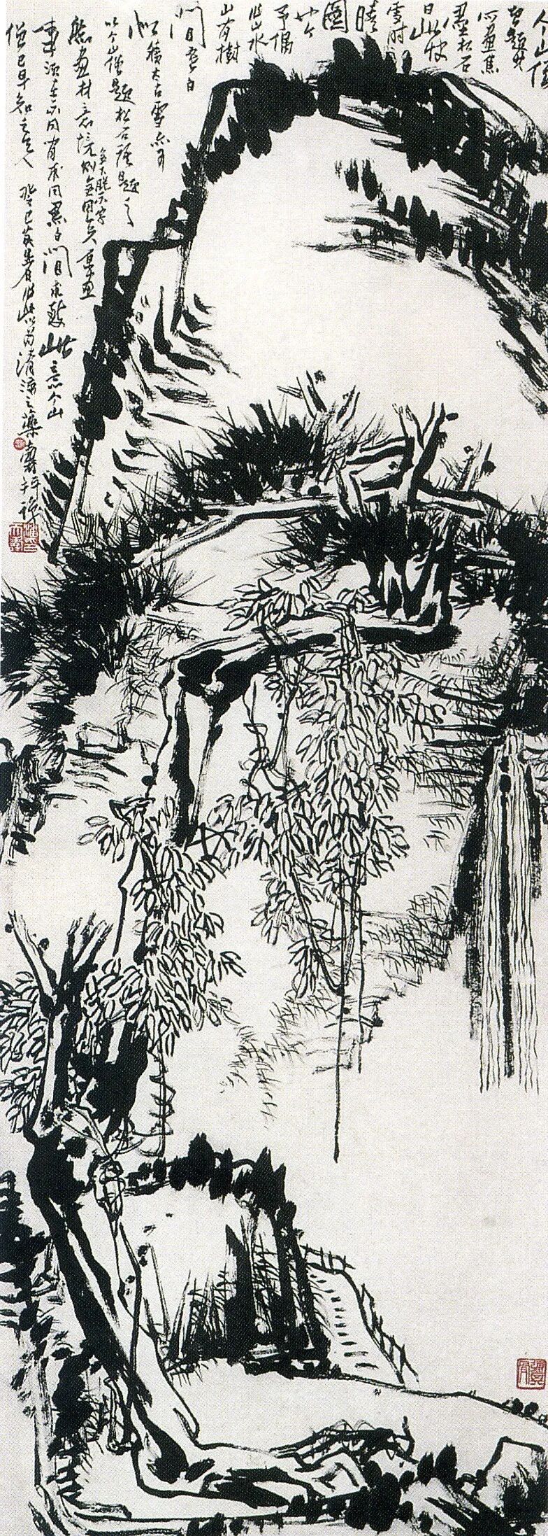 潘天寿 焦墨山水图轴 183.3×66cm 纸本墨笔这里讲的也是意外之意。八大以圆笔为主。潘先生用方折拗转,加切、削、凿,山石水流以按为主,凝重清劲;树叶苔草则用提笔,流动有声。又如《松石图》的题跋:偶然落笔,辄思古人屋漏痕、折钗股。石积太古雪,树飞铁铸青者,不胜悁悁……潘天寿 松石图轴 179.5×140cm 纸本设色再如《灵岩涧一角图》的题跋:画事以积墨为难,兹试写之,仍未得雁山厚重之致。潘天寿 灵岩涧一角 116.7×119.7cm 纸本设色潘先生以小见大,只画灵岩涧一角,却要用积墨法表现雁荡山的厚重。苔草上浓淡点擢,积墨多者四层;笔笔见笔,层次分明。沉厚通透,苔草之郁密,衬出山花之妖艳。再用“疏处用疏,密处加密”,使“极塞实处愈见虚灵”,且设色沉古。“青绿重色,为秾厚易,为浅淡难,为浅淡而愈见秾厚为尤难”,此幅石青、石绿,浅淡而秾厚沉深,大都用笔点擢,不以平涂故,画出了郁密沉古的味道。古人作花鸟,间有采取山水中之山石为搭配,以辅助巨幅花卉意境者……予喜游山,尤爱看深山绝壑中之山花野卉,乱草丛篁……其姿致之天然荒率,其意趣之清奇纯雅,其品质之高华绝俗……故予近年来,多作近景山水……有异于古人旧样,亦合个人偏好耳……故看潘先生的作品,更有超出一般“意境”之外者——荒率、清奇、高华。有“意外之意”,作品必然异于旧样。1959年所作《百丈岩古松图》可为代表。“不落畦径,谓之士气;不入时趋,谓之逸格”(《南田画跋》)。自古至今,中国画逸格之两端,我以为倪云林与潘天寿为代表。作于1961年的《小亭枯树》的题跋云:曾见天池生拟倪高士小亭枯树轴,笔意奔放,格趣高华,蕴荒寒于古简之外,至为难得,兹再拟之,不识落谁家面目耳。有至大,至刚,至中,至正之气,蕴蓄于胸中,为学必尽其极,为事必得其全,旁及艺事,不求工而自能登峰造极。品格不高,落墨无法。钻小眼子的人,布局不会廓大,萎靡不振的人,画不出劲健的意趣。所以人要养刚劲的意趣,这样,他的画必然会高的。(以上讲课谈话笔记)刘熙载论书法曰: “书,如也。如其学,如其才,如其志,总之曰如其人而已。”(《艺概》)这可以移来论画。“画如其人”,于潘天寿先生得到充分的证明。正如他的《论画残稿》所说:品格高,落墨自超。此乃天授,不可强成。境超,即不止而“止止”, 进进不止,止于所当止。不止,谓自强不息,从对八大、石涛等的赞赏可见,潘先生一直在进步。他的作品早年外张多,内敛少,方笔多有肆气的成分,后逐渐转为方中含圆,张而不肆。止止,即“为道日损”,艺事必须围绕自己的真性情,应自主,非他主。“逸”,引用牟宗三先生的话,“开始必须有魄,才无一切陈套”。不拘于一切规矩,不限于一切表面形式的牵制。“逸”是表现真性情,而不陷溺,“洒脱而谨严”。“雄”,力大,一笔过去,雄健,有骨趣。他和我们说顾恺之画论时,总是讲骨趣,有奇骨。“奇”,指章法的奇险。“章法”是中国画的结体原则(一般),“构图”则千变万化(个别)。大画要“放得开手,团结得住”,小画要“会心四远,小中见大”,又都要“得奇趣于画外”。潘先生有一套“边角学问”,善于经营边角的出入和虚实。“古”,赵孟頫说“作画贵有古意”, “古意”不是复古。《春秋·谷梁传》中说“达心则其言略”。古意,即是“简”和“真”。