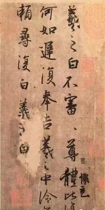 释文:羲之顿首:丧乱之极,先墓再离荼毒,追惟酷甚,号慕摧绝,痛贯心肝,痛当奈何奈何! 虽即修复,未获奔驰,哀毒益深,奈何奈何!临纸感哽,不知何言!羲之顿首顿首。摹本,纸本。纵28.7厘米。8行,62字。行草书。日本皇室藏。此帖与《二谢帖》、《得示帖》共一纸。永和十二年(356)书。书信反映了王羲之对北方故乡的祖坟被破坏的愤怒和悲伤。