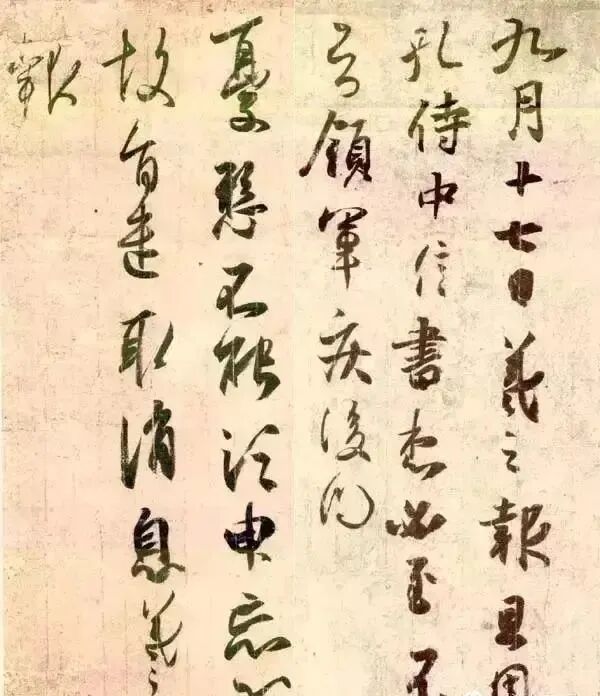 释文:九月十七日羲之报:且因孔侍中信书,想必至。不知领军疾后问。忧悬不能须臾忘心,故旨遣取消息。羲之报。摹本,纸本。纵26.9厘米。6行,42字。行书。日本东京前田育德会藏。此帖与《频有哀祸帖》共一纸,或将二帖总称为《孔侍中帖》或《九月十七日帖》。与《丧乱·二谢·得示帖》同为唐代流入日本的王羲之名迹摹本。《频有哀祸·孔侍中帖》在活泼的行书笔意中带有凝重之感。在章法结体上又显示出欹侧取妍的艺术效果。