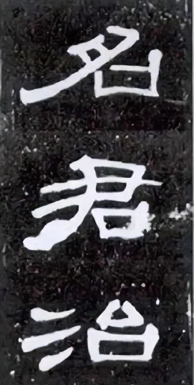 其次,再看转折关系。先看《礼器碑》中“石”字(图十二),口部左边一竖似撇,与底部一横若断若连。从《相利善剑》中“中”、“者”等字(图十三)看,“口”部应由两笔书写而成,左竖和底部一横为一笔,上横和右竖为一笔,两笔之间有回旋之笔势。《礼器碑》中的“石”字,或许是因为刻手的缘故,圆转用笔难以镌刻,或是因为碑石年久风化侵蚀,导致两笔断开。如果仅以碑刻来看,就难以解释左边一竖为何向左撇出。而“乾”字对这种书写性表现得就相对明显一些。同样的情况,在《曹全碑》中表现得更加夸张,如“名”、“君”、“治”等字(图十四),右上角的转折向上耸起,形成《曹全碑》的特有的转折特征。这种写法与左下角道理相同,横画行笔至末端逐渐提起,再向上回旋顺势竖下。有时候因提笔幅度较大,横竖之间容易断开,但笔断意连。如果没有从汉简中理解其笔势关系,就很容易孤立地看待这两笔。早期隶书“口”部的写法大多都是此种两笔写法,之后逐渐出现类似楷书的三笔写法。特别是在汉碑隶书当中,由于刻手不可能像书写那样仅施以两刀,而势必要分开镌刻,从而割裂笔势间的连带关系。当然,有些刻手也能较好地表现出汉简隶书的书写性,汉碑中如《乙瑛碑》、《曹全碑》等。